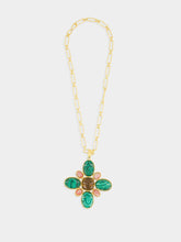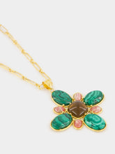 This exquisite gold necklace features a unique pendant adorned with malachite, rhodochrosite, and smoked quartz. The combination of rich green, soft pink, and deep brown hues creates a harmonious and eye-catching accessory perfect for sophisticated occasions.