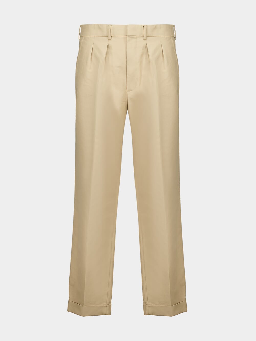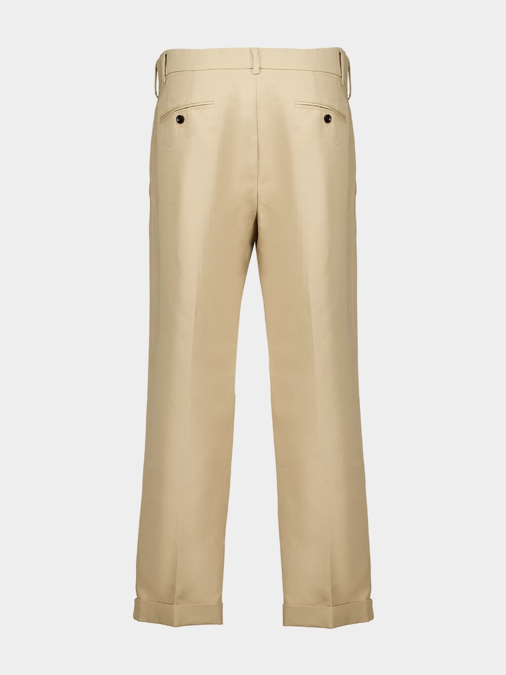 These beige-colored semi-sartorial trousers are crafted from 100% cotton satin for a refined and polished look. Featuring a double pleat design, they offer a tailored yet comfortable fit. The luxurious satin finish adds a subtle sheen, enhancing their sophisticated appeal. Made in Italy, these trousers are perfect for formal or semi-formal occasions, combining timeless elegance with modern tailoring.