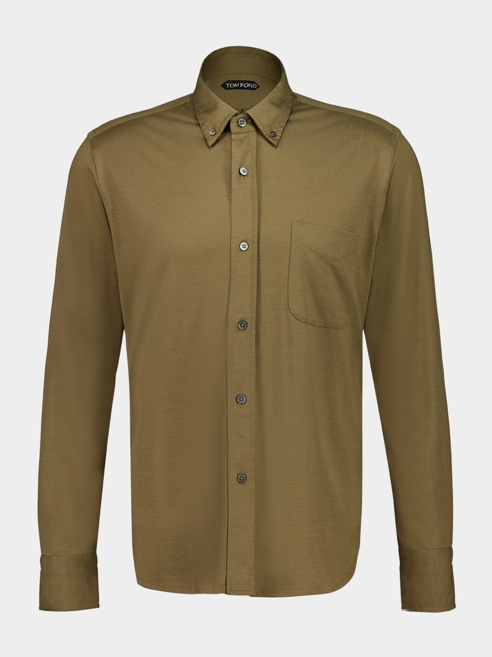 This olive green button-down shirt by Tom Ford is crafted from a luxurious silk-cotton blend, offering a smooth, lightweight feel and sophisticated look. Featuring a classic button-down collar, long sleeves with buttoned cuffs, and a chest pocket with a tailored finish, this shirt is versatile for both formal and casual occasions. Made in Italy, it embodies refined craftsmanship and timeless elegance.