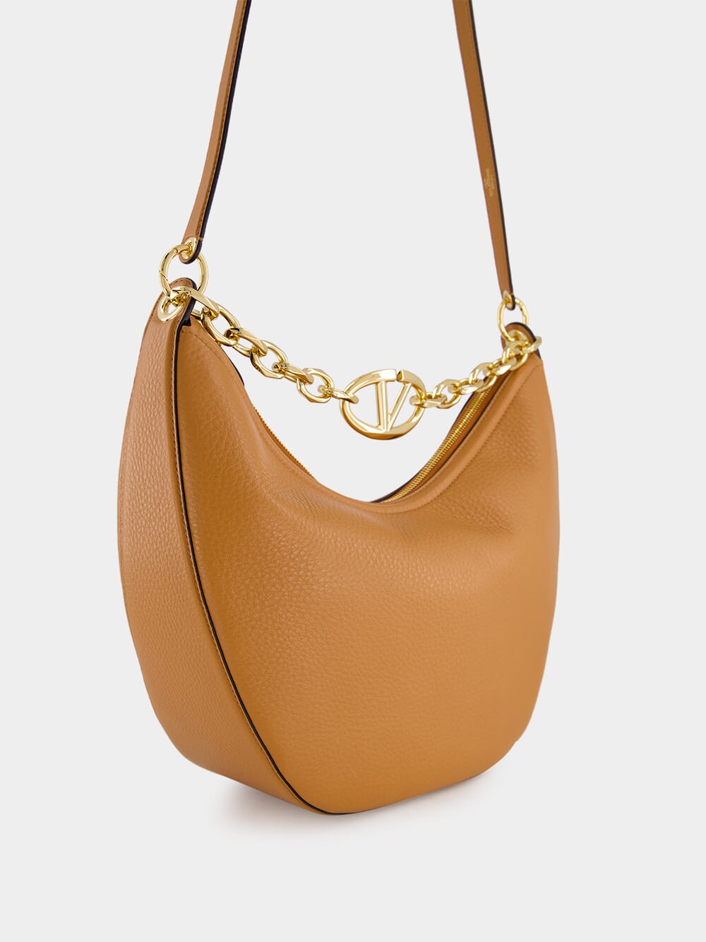 This medium Hobo Moon bag in light brown hammered leather exudes modern elegance and practicality. Accented with gold-tone hardware, it features a striking chain handle with the signature VLogo detail. The bag also comes with a removable shoulder strap for versatile styling options. The zip closure opens to a lined interior, complete with a card slot for added convenience. Finished with an embossed logo on the back, this bag combines sophisticated design with functional storage, making it perfect for both casual and elevated looks.