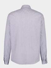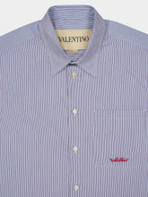 This Valentino long-sleeved shirt is crafted in fine cotton with a blue and white micro millerighe stripe pattern. It features a classic button-up front, a pointed collar, and a chest pocket embroidered with the Valentino logo in red. Designed with a tailored fit and refined details, this shirt brings understated elegance and Italian sophistication to both formal and smart-casual ensembles.