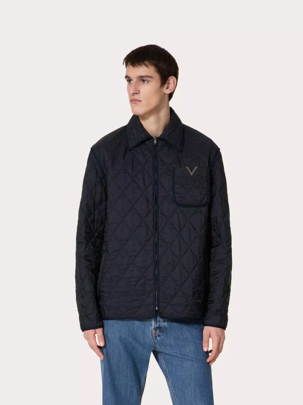 This Valentino quilted nylon shirt jacket offers a blend of comfort and style. It features a regular fit, lined interior, and light padding for added warmth. The jacket is designed with a metallic V detail on the breast pocket, zip closure, two side pockets, and one breast pocket on the left side as worn. Ideal for layering during cooler seasons, this navy jacket adds a touch of sophistication to any outfit.