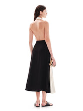 The 'Rhodes' Pleated Halter Neck Dress is an epitome of masterful craftsmanship, featuring a sophisticated halter neck that leads to an alluring plunging neckline. The contrasting pleated skirt in blue adds a dynamic visual effect, while the open back exudes sensuality. This dress shapes a sculpted silhouette that's both daring and elegant, perfect for the modern woman with an appreciation for bold yet refined style.