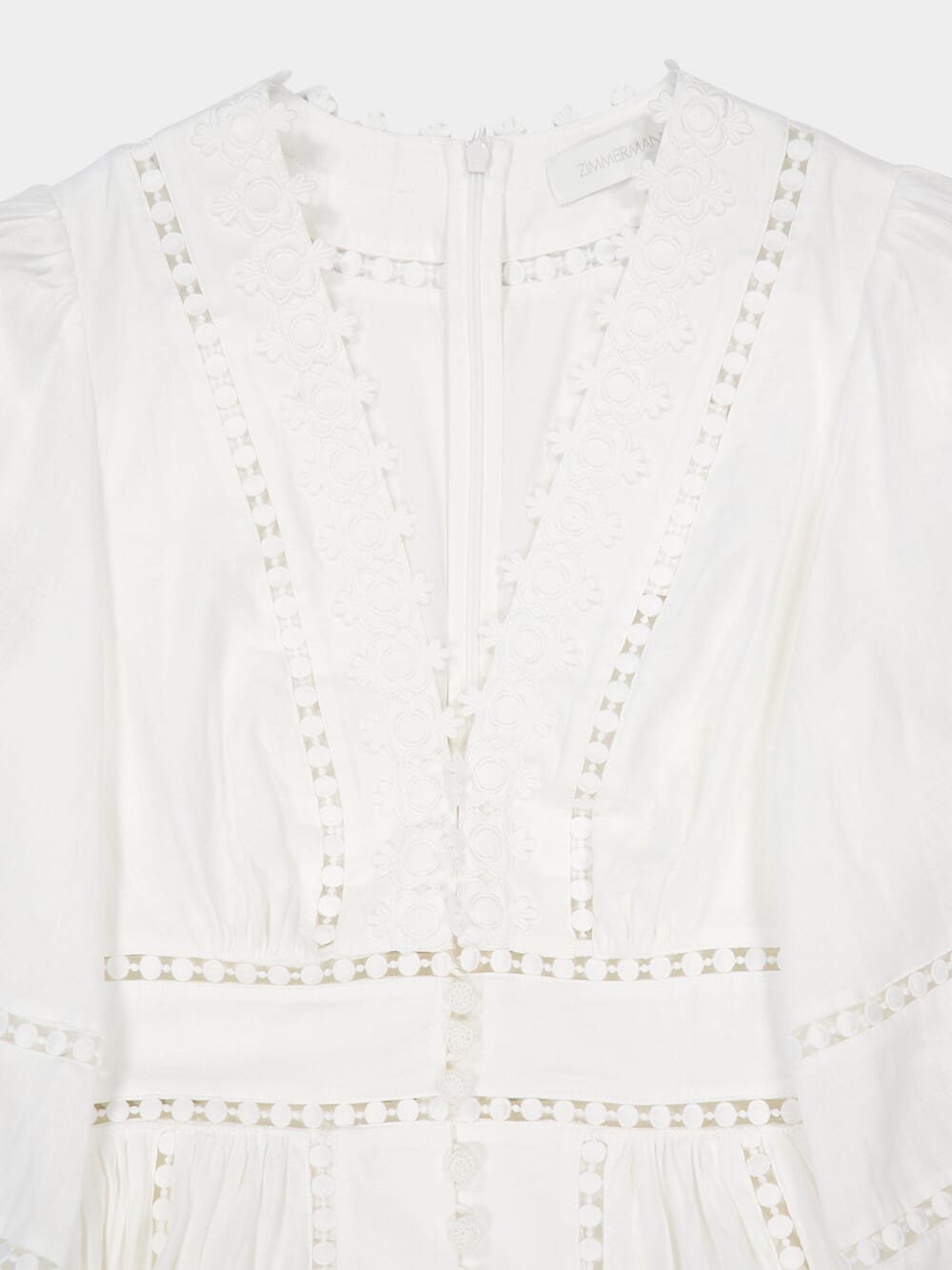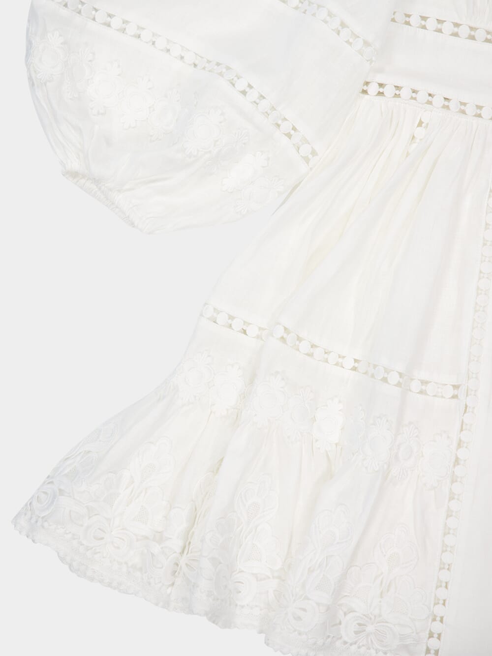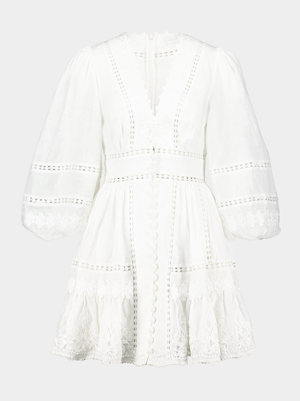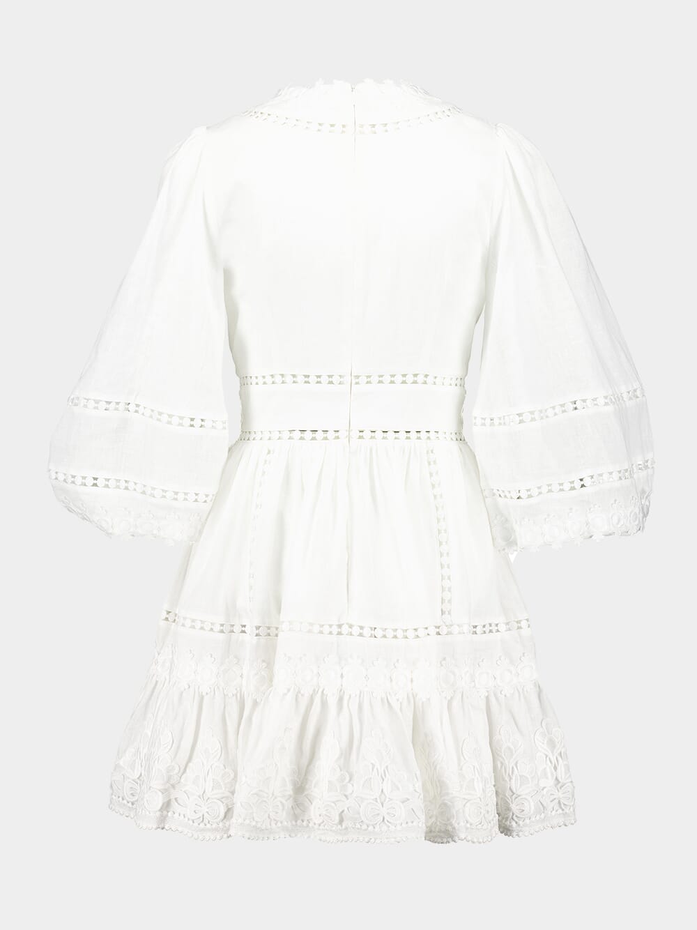 This exquisite Ivory Lace-Trimmed Mini Dress is a beautiful blend of elegance and charm. Crafted from fine linen with delicate lace trim, it features openwork detailing and floral appliqué accents. The dress showcases a flattering V-neck and long sleeves with elasticated cuffs. The fitted waistline enhances the silhouette, while the pleated detailing and flared hem add a touch of femininity. A front button fastening completes this sophisticated piece, perfect for special occasions and romantic outings.