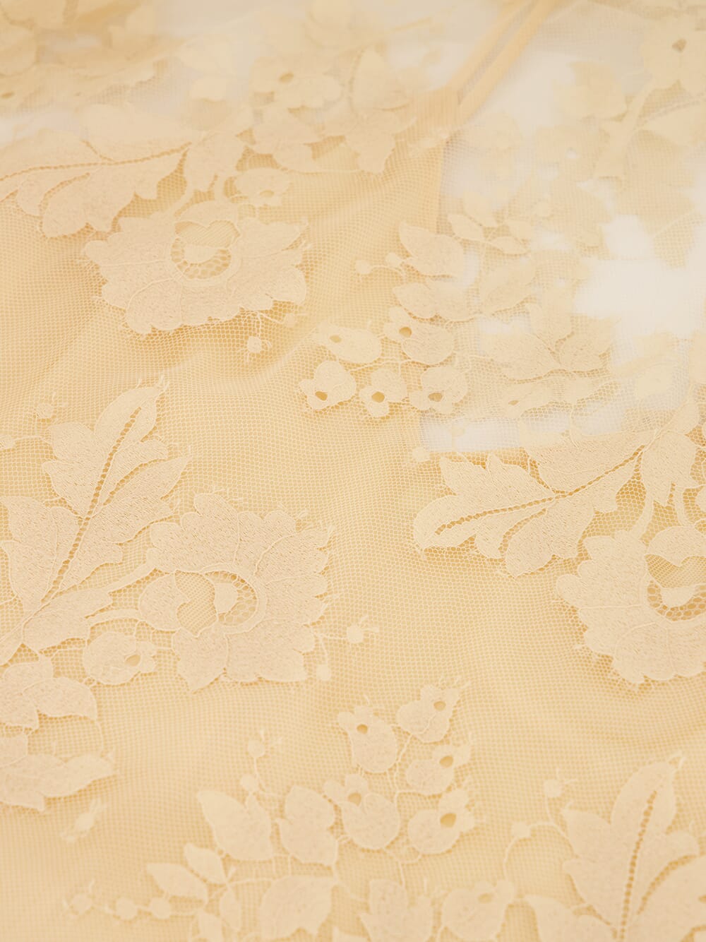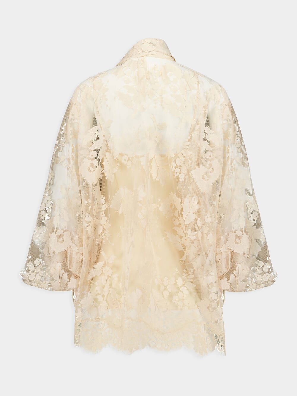 This elegant lace blouse in a delicate light tea hue features a relaxed silhouette. The intricate lace detailing is complemented by long blouson sleeves and a gathered cuff with zip closure. An adjustable self-tie collar with a zip opening on the shoulder adds a refined touch. The blouse is finished with a lace trim at the hem and comes with a separate slip featuring adjustable straps for a versatile and sophisticated look.