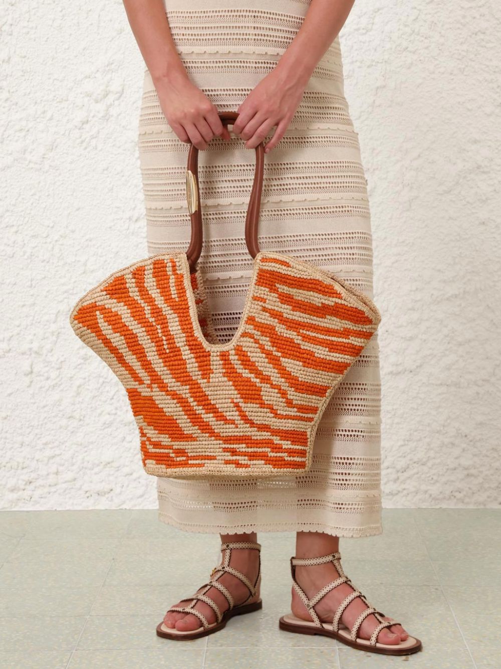 The Goldentime Medium Tote in orange zebra is a statement summer accessory, handwoven in soft raffia. With its unlined interior and lightweight construction, this tote is ideal for carrying essentials from the beach to the city. The tubular handle, adorned with surfboard-inspired hardware, echoes the silhouette’s organic, surf-influenced design. A unique crochet pattern gives this piece a refined texture, making it both functional and artistically expressive. Its dual carry options offer versatility for the modern, style-conscious woman.
