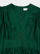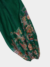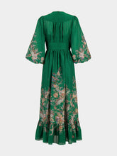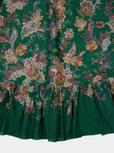 The Rhiannon Plunge Maxi Dress in Green Multi Paisley exudes romantic elegance with its flowing silhouette and rich details. Crafted from 100% cotton, it features a plunging V-neckline, voluminous sleeves with gathered cuffs, and a fitted waistband that enhances the figure. A softly flared skirt with a frilled hem, side pockets, and a concealed back zip closure add practical charm. Includes a separate slip for comfort and coverage. Ideal for summer occasions with timeless flair.