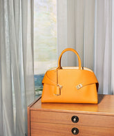 Ferragamo’s sculptural Hug Bag design radiates warmth in dark honeycomb orange. This vibrant shade injects fearless energy into classic silhouettes, turning the bag into a statement that redefines how confidence can be carried.