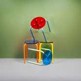 His iconic Le Pop stool, inspired by a school chair found in a flea market, reinvents vintage furniture with bold colors and recycled materials. Handcrafted by craftspeople in France from steel and recycled acrylic, it's 100% recyclable, reflecting Badier’s commitment to sustainability.