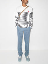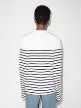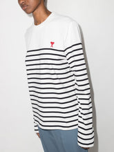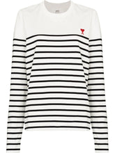 Ami Paris white knitted organic cotton jumper with black stripes and red Ami de Coeur monogram embroidery.