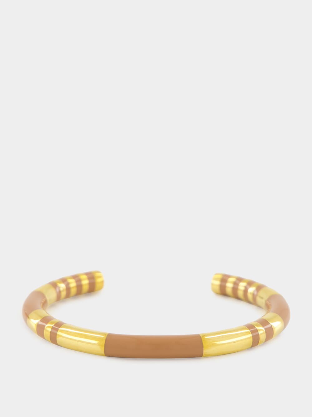 The Twisted Diana bangle by Aurélie Bidermann in cappuccino resin embodies retro elegance with a modern twist. Inspired by 1960s hippie torques, the sculptural design is wrapped in a delicate golden thread, gilded with 750/1000 yellow gold, mimicking the graceful curves of a vine. Its warm hue and bold form make it a sophisticated everyday statement piece.