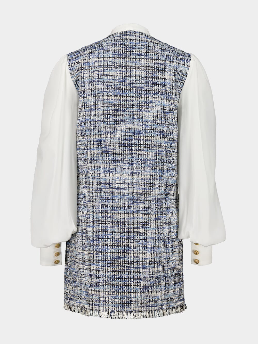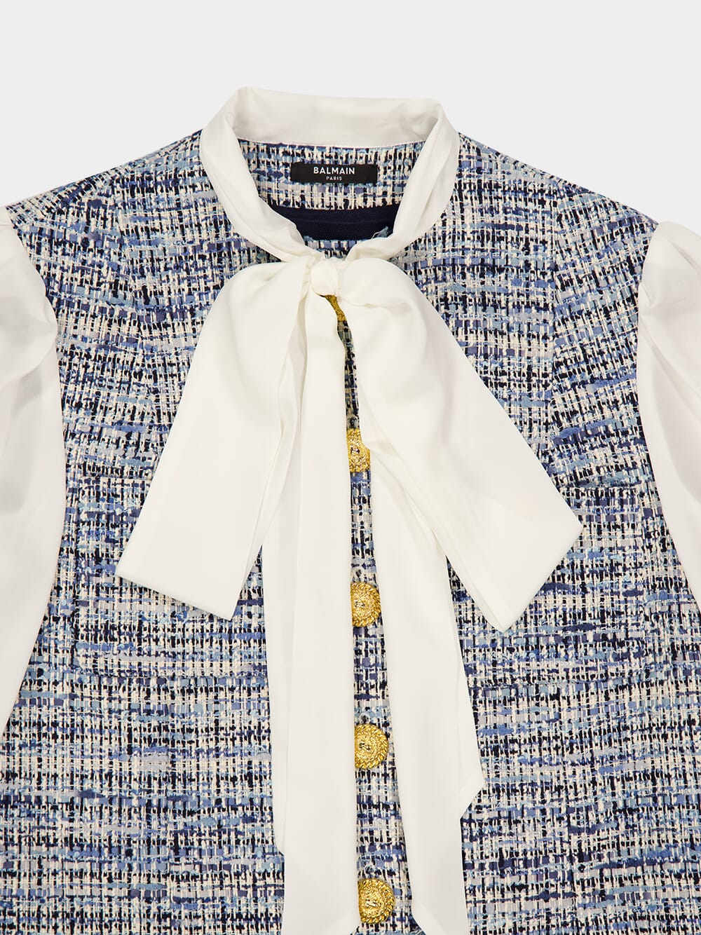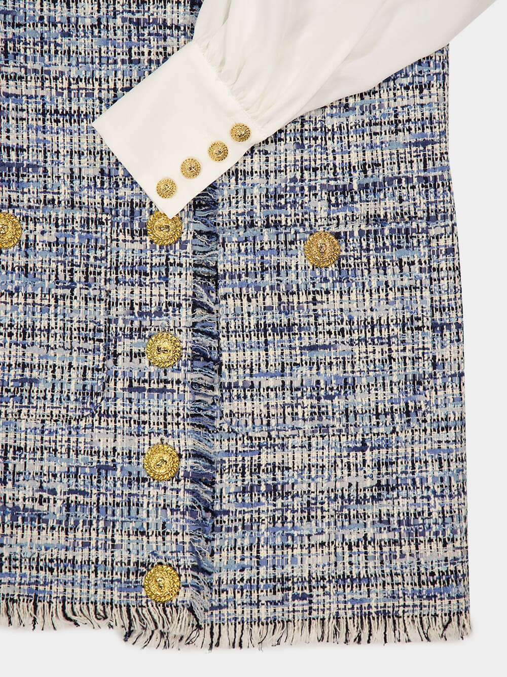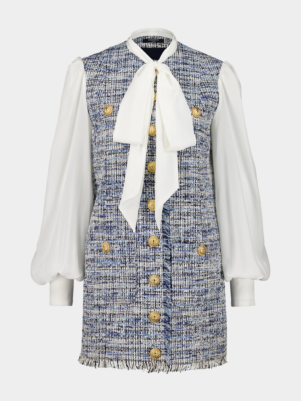 This elegant blue tweed dress by Balmain combines classic tailoring with feminine charm. Featuring a textured tweed body adorned with gold-tone embossed buttons, it is paired with soft crepe puffed sleeves and a statement pussy bow at the neckline. The four-pocket design enhances its structured silhouette, while the fringed hem adds a touch of modern edge. Perfect for sophisticated occasions, this dress exudes timeless Parisian style.