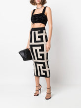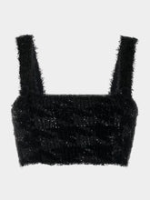 Balmain black tweed crop top with wide straps, golden embossed buttons and back zip closure.