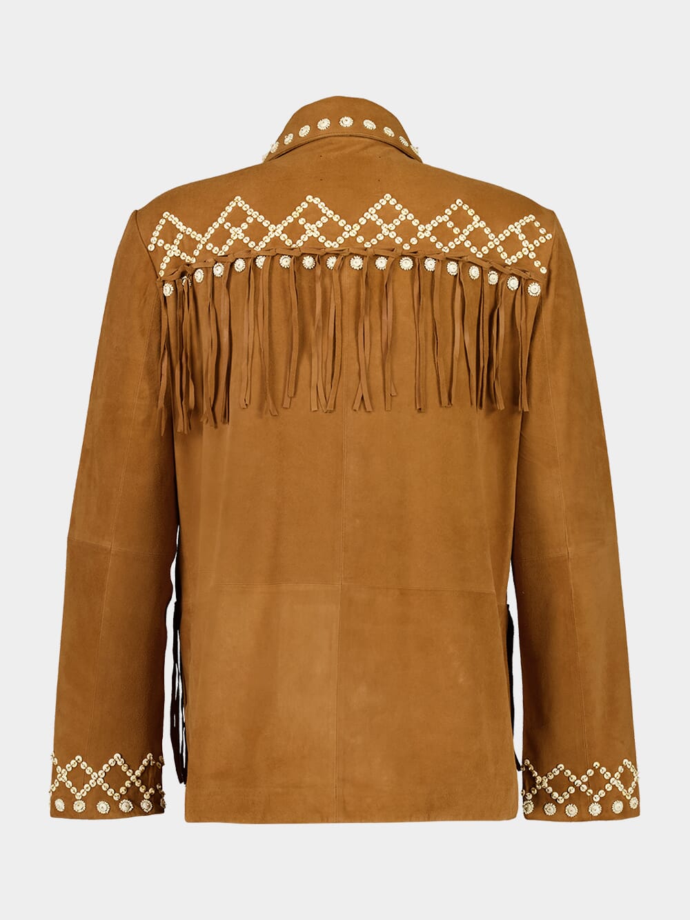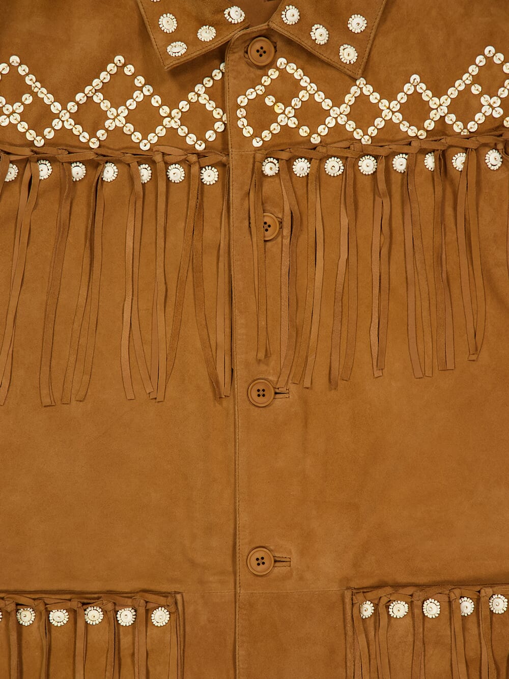 This brown Jeepn jacket, crafted from 100% suede, offers a bold and stylish look with its fringed design and intricate bead detailing. Featuring front pockets for practicality, the jacket combines functionality with a touch of boho flair. The unique fringes and beads make this suede jacket a standout piece, perfect for adding a statement to your wardrobe.