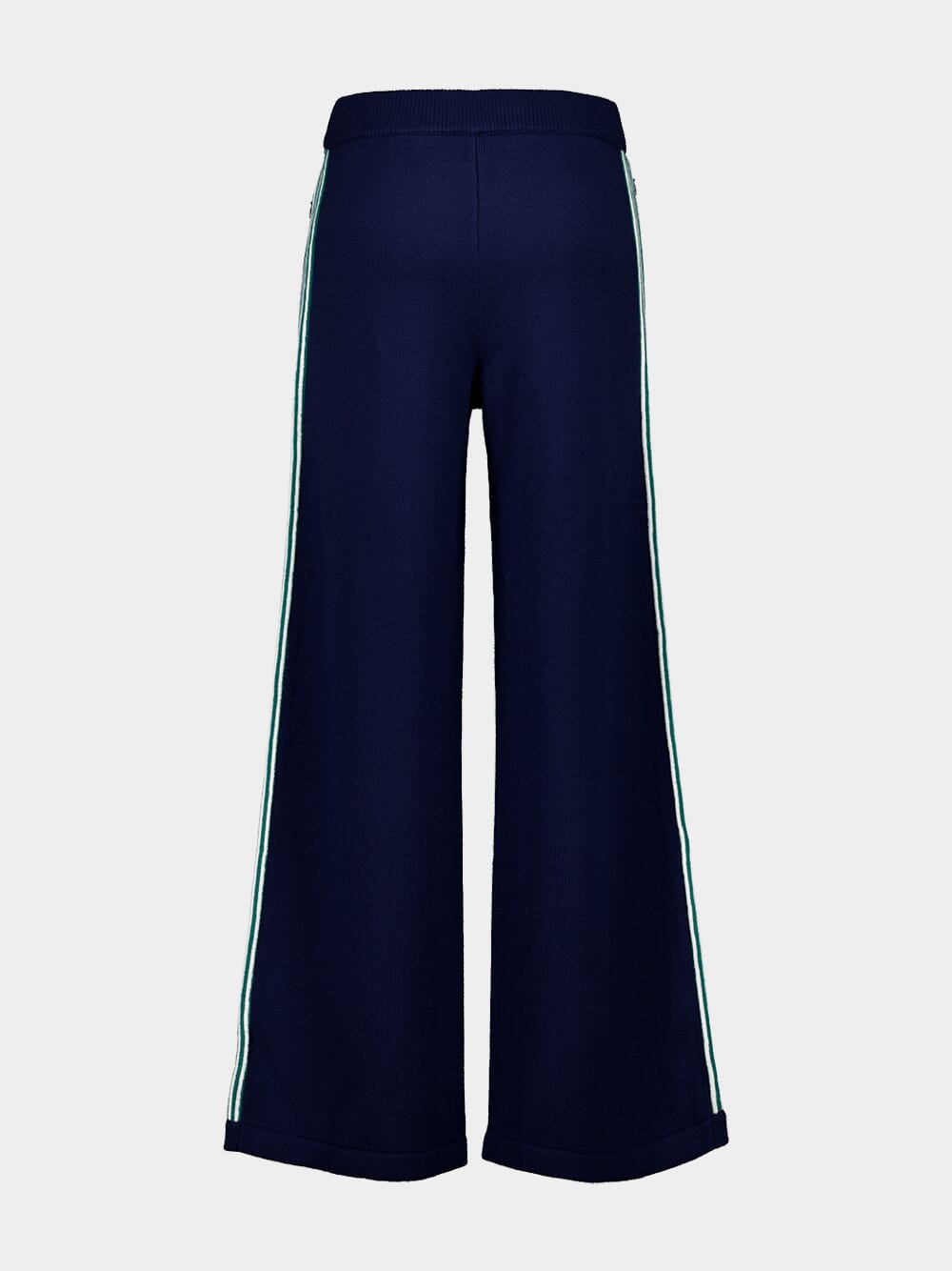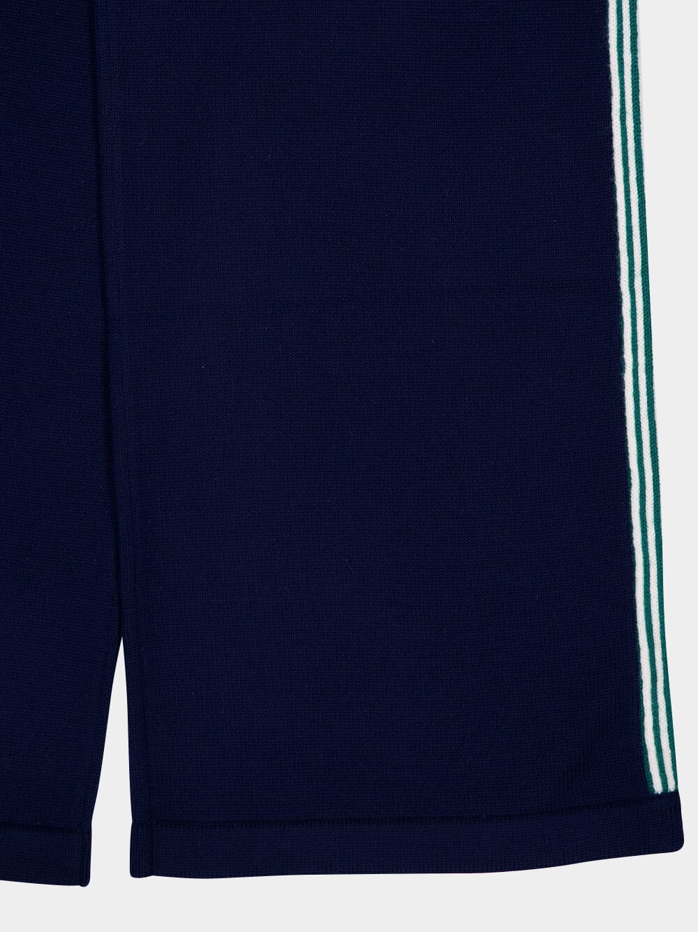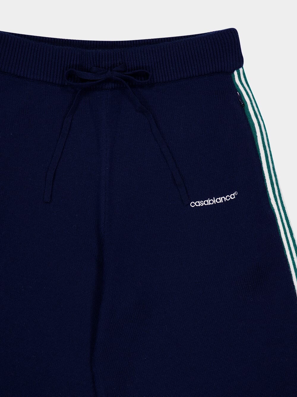 These navy knit tennis trousers are a refined straight-leg design, crafted from 100% merino wool for a luxurious and comfortable fit. Featuring an elasticated waistband and in-seam side pockets, they are both functional and stylish. The contrasting green stripe detail along the sides and the signature embroidered Casablanca logo add a touch of sophistication. Perfect for casual and athleisure-inspired looks, these trousers fit true to size and are ideal for versatile styling.
