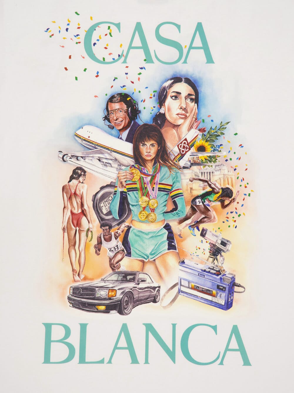 The Celebration Du Sport T-Shirt features a bold graphic inspired by vintage movie poster designs, celebrating the brand’s signature playful storytelling. Made from 100% organic cotton, the short-sleeved t-shirt is lightweight and breathable, ideal for casual wear. A crew neck and loopback jersey fabric complete the design, offering both comfort and style. The back showcases vibrant artwork that enhances its unique appeal.