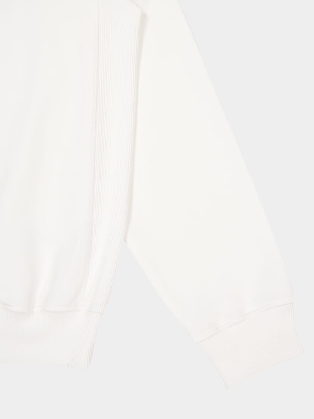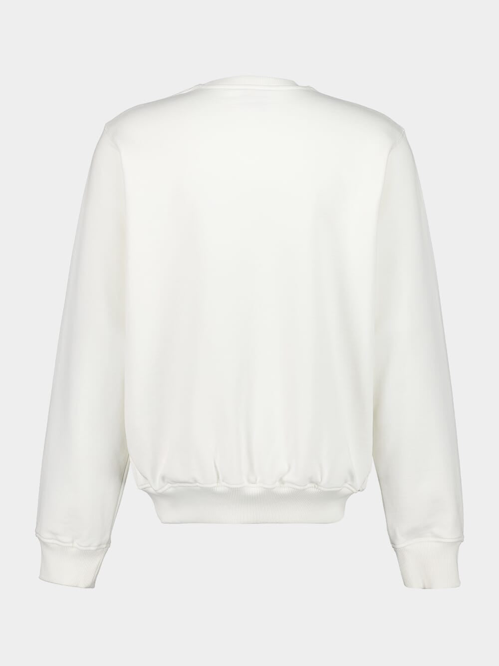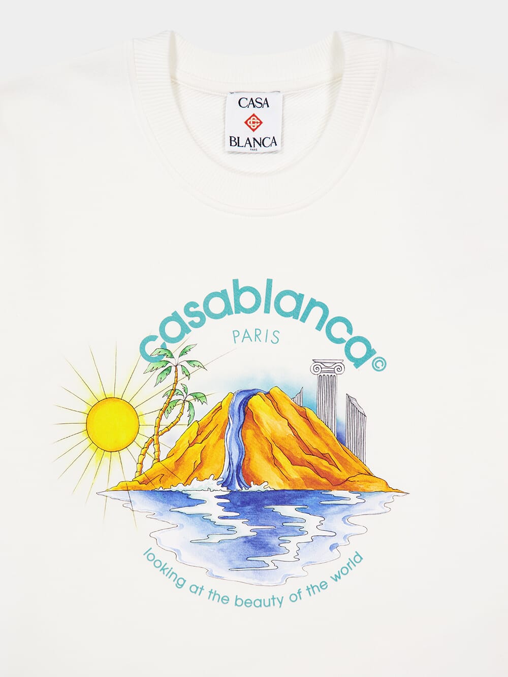This white sweatshirt combines comfort and artistry with its organic cotton construction and bold Oasis print on the front. Featuring ribbed cuffs, hem, and collar for a structured fit, the design is elevated with vibrant colors that evoke a serene tropical escape. Perfect for casual outfits, it’s a must-have piece for relaxed yet stylish occasions.