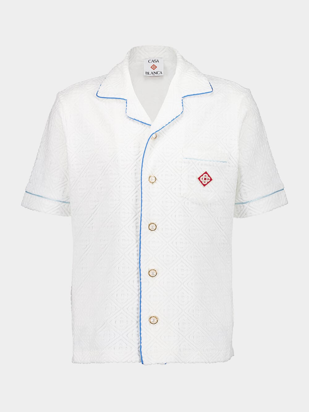 The White Tennis Stripe Towelling Shorts are a refined yet casual design crafted from luxurious monogram towelling fabric, showcasing the house's diamond logo. These shorts feature an elasticated waistband with an internal gold-tipped drawstring fastening for a custom fit. Details such as pin tuck seams, slanted side pockets, a back zip pocket, and elegant piping along the pockets and sides enhance the tailored look. Perfect for relaxed yet sophisticated summer styling. Made in Portugal with a meticulous focus on quality.