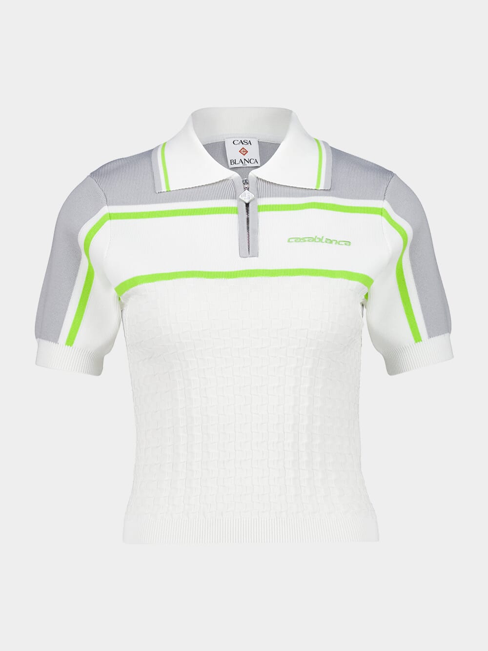 Sporty minimalism meets elevated tailoring in this White Zip-Up Jacket by Casablanca. Crafted from a soft, technical viscose blend, the streamlined silhouette is punctuated with neon green piping and contrast ribbed collar detailing. The piece features a zip closure with the signature Casablanca charm pull and discreet embroidered branding at the chest.