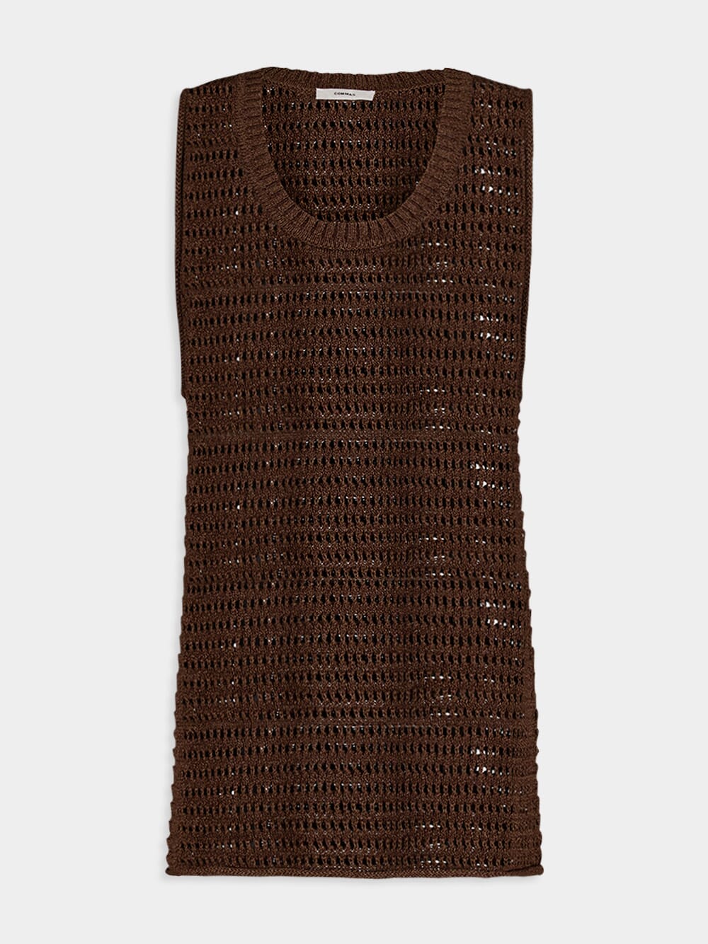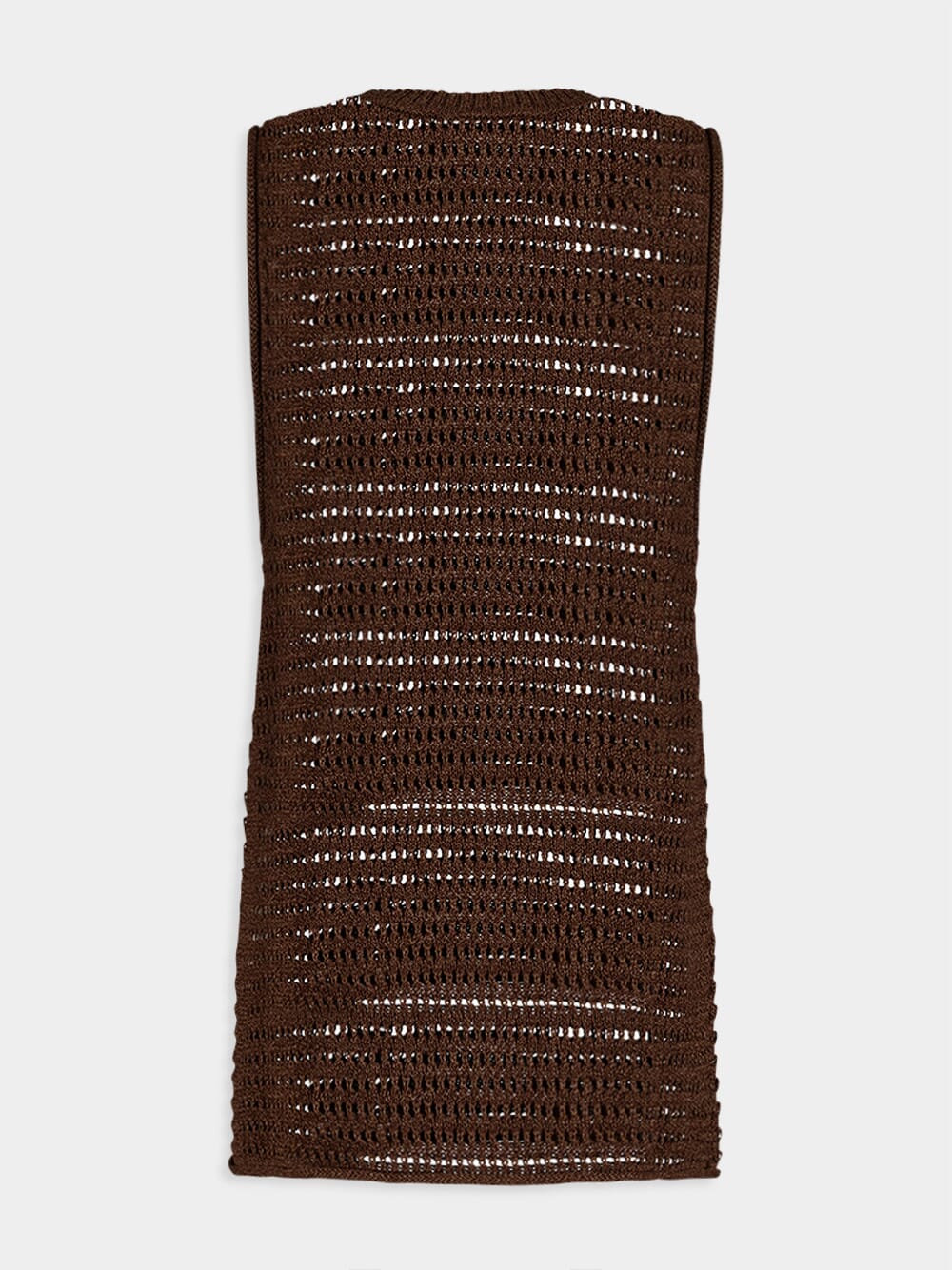 This brown tank top features an intricate open-knit design, blending a casual silhouette with a touch of elegance. The breathable fabric makes it an ideal choice for warm weather, offering a stylish layering option or a standalone piece for a relaxed look.