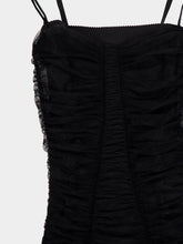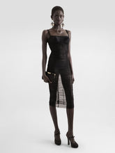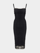 A tribute to bold femininity, this black tulle calf-length dress from Dolce&Gabbana's Spring/Summer 2025 collection exudes timeless elegance. Inspired by 1950s lingerie, it features delicate draping, a straight neckline, and slender spaghetti straps. The silhouette is complemented by a stretch silk crepe de chine slip for added fluidity and comfort. A concealed rear zipper and hook-and-eye fastening ensure a seamless fit. Crafted in Italy, this sophisticated piece is perfect for refined eveningwear.