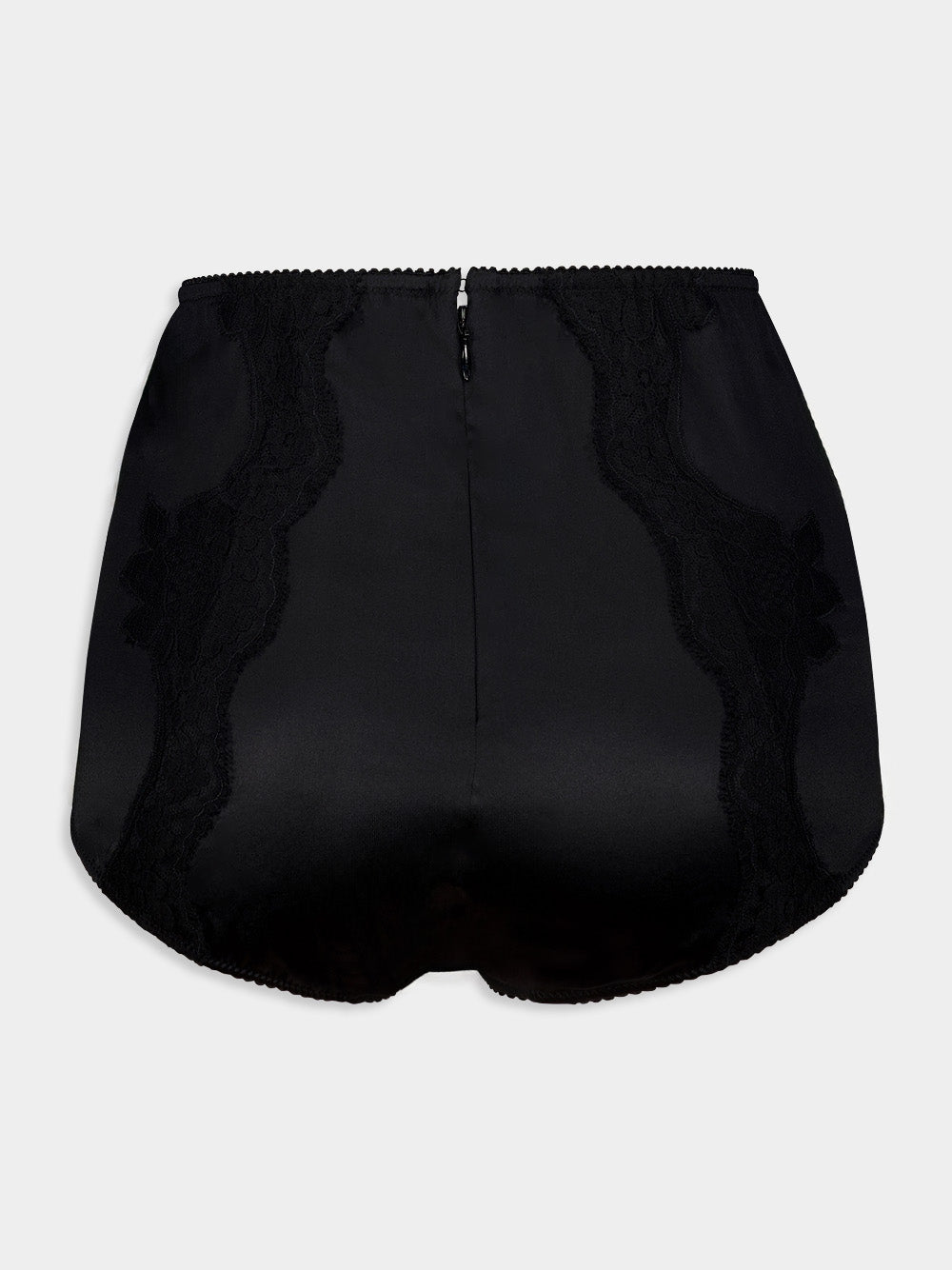 Embodying sophistication, these black high-waisted briefs by Dolce & Gabbana are crafted from luxurious silk satin. The design features an elastic waistband, a concealed back zip and hook fastening, and is delicately trimmed with lace, blending comfort with elegance.