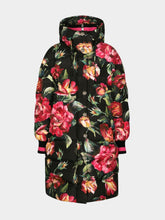Dolce & Gabbana black nylon long down jacket with floral print, overized fit and fine-rib cuffs and neck with striped detailing.