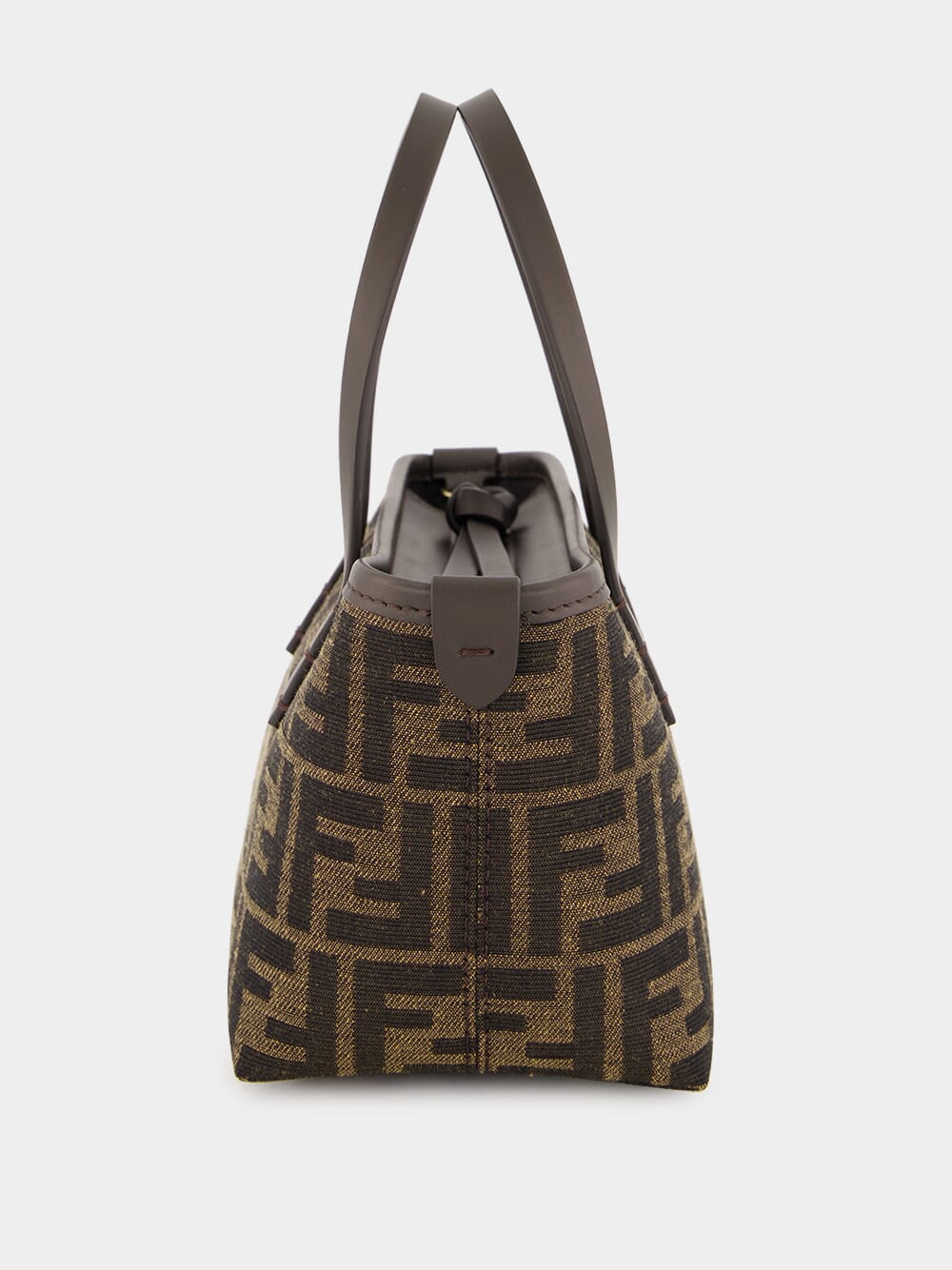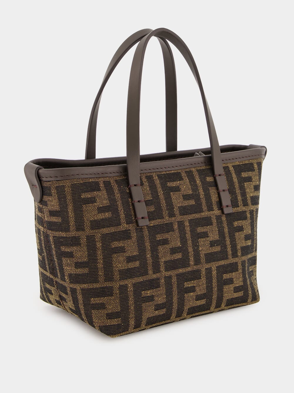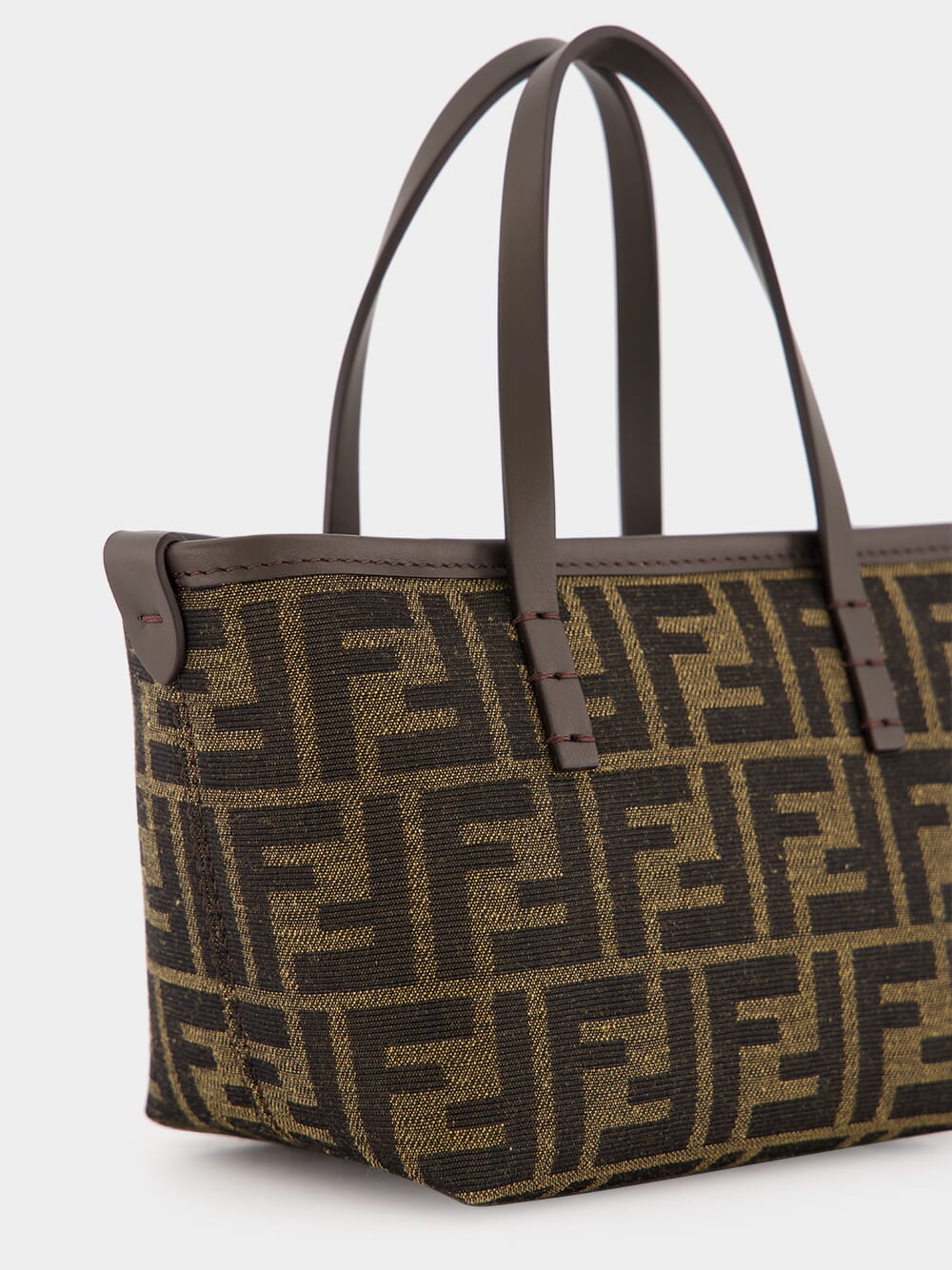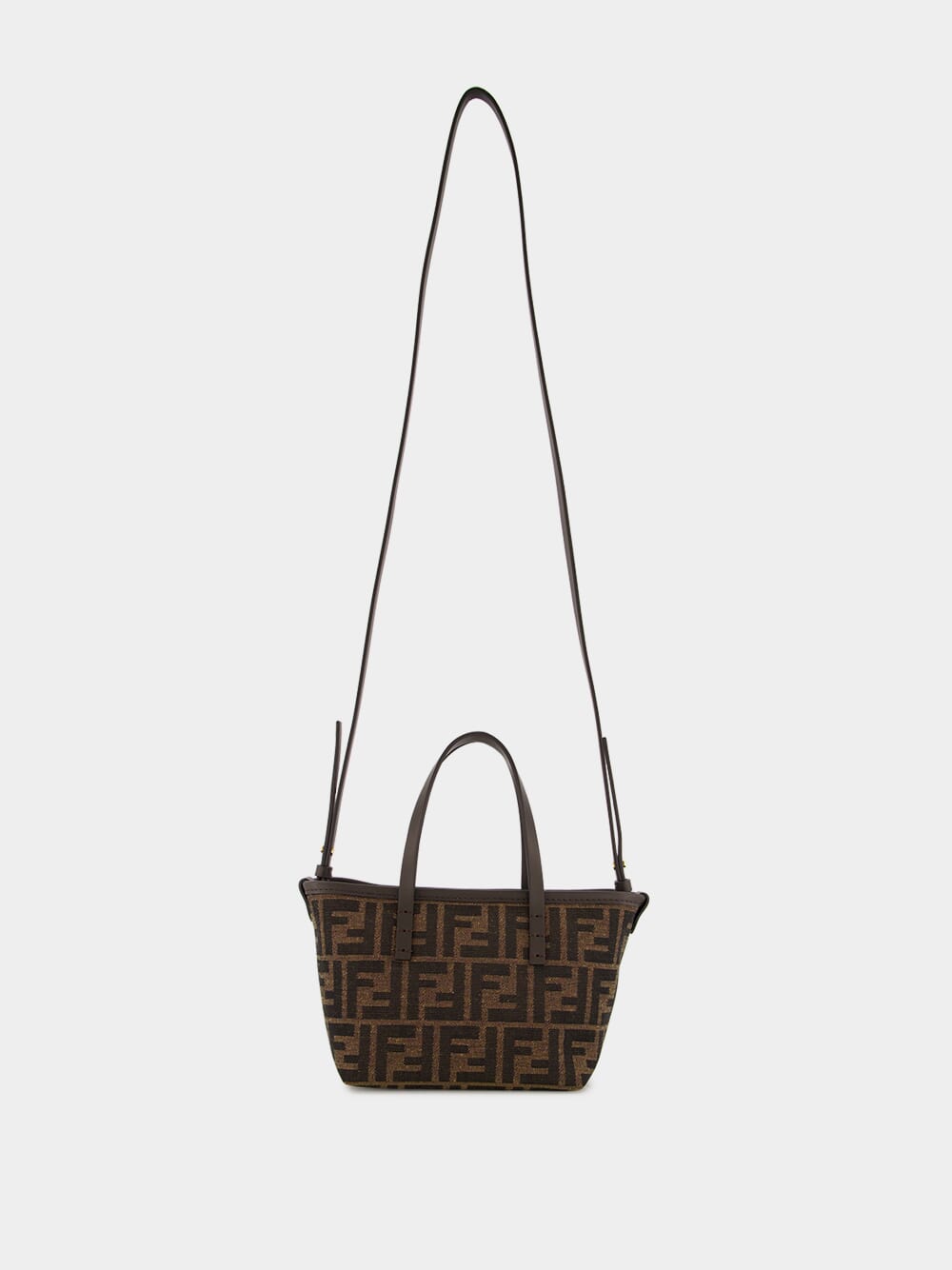 Fendi Roll Mini bag in iconic brown FF jacquard fabric, accented with dark brown leather trim. Features a zip closure with a knotted leather pull, lined interior, and gold-finish metalware. Removable strap allows versatility as a shoulder or hand bag.