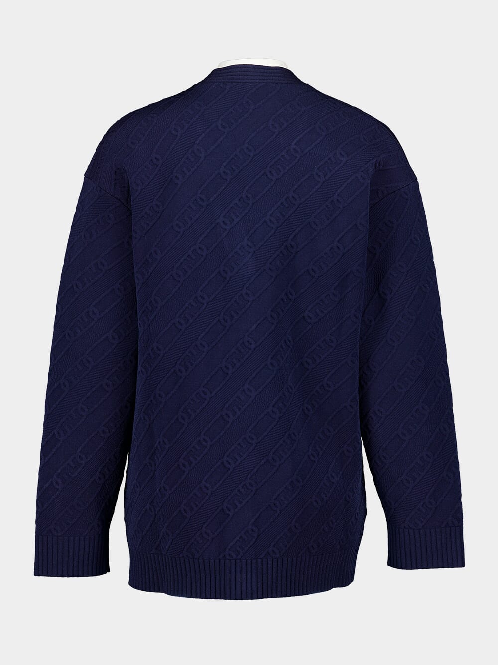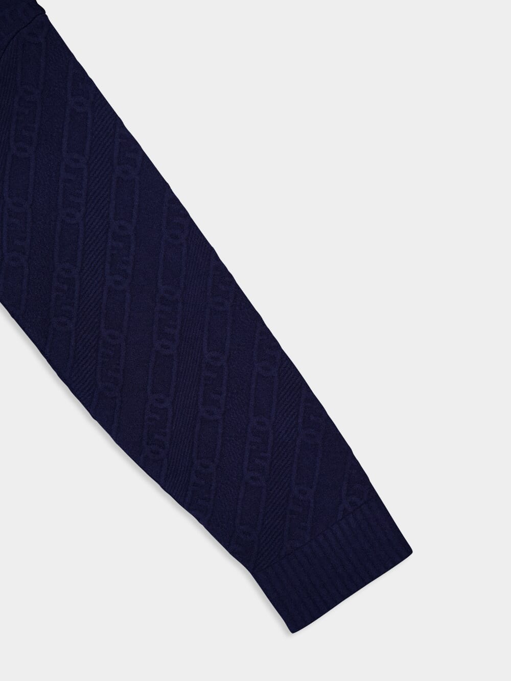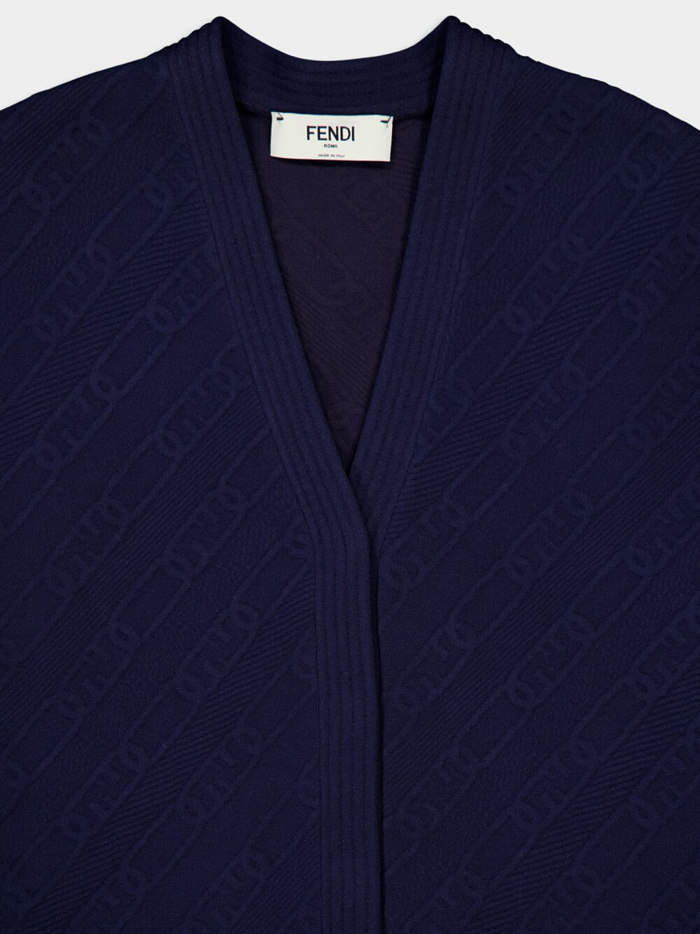 Luxurious navy cardigan by Fendi featuring a V-neck design, long sleeves, and an all-over tonal embossed O’Lock chain logo pattern. Finished with front pockets and ribbed trims, this piece exudes timeless elegance and comfort.