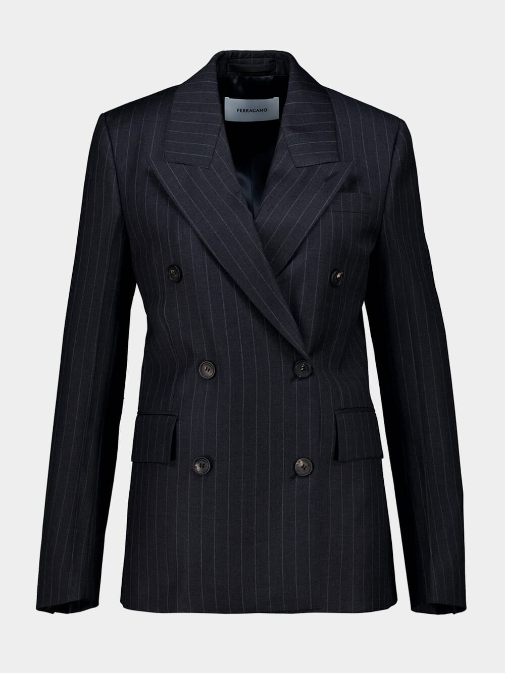 Crafted from 100% pure virgin wool, these charcoal pinstripe trousers draw inspiration from traditional men's tailoring with a refined, feminine twist. The low-slung waist and wide-leg silhouette are balanced with double front pleats that create a soft, elegant volume through the leg. Featuring timeless pinstripes reminiscent of 1930s suiting, this Italian-made piece is a sophisticated essential for polished, modern wardrobes.
