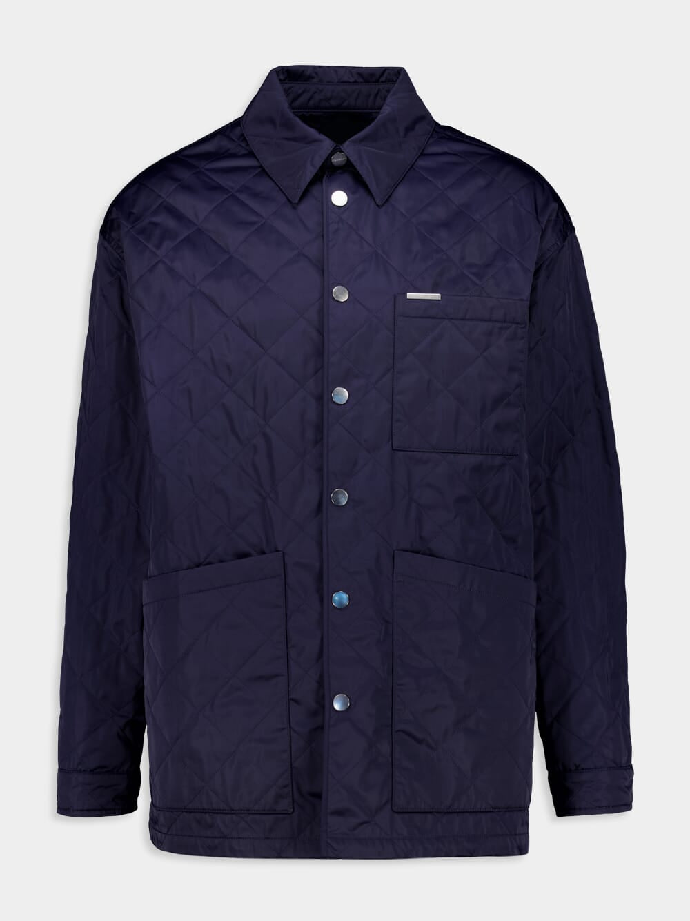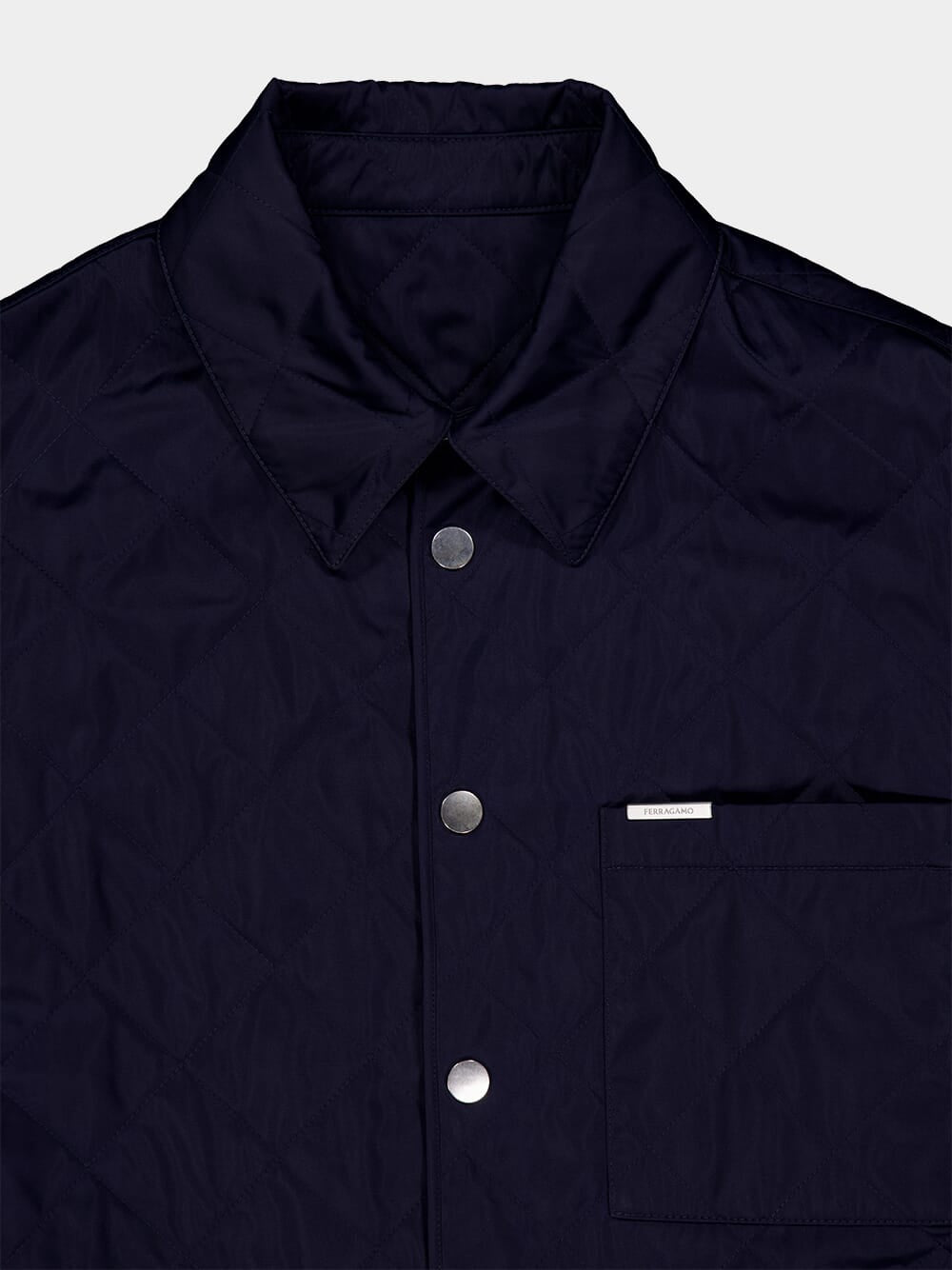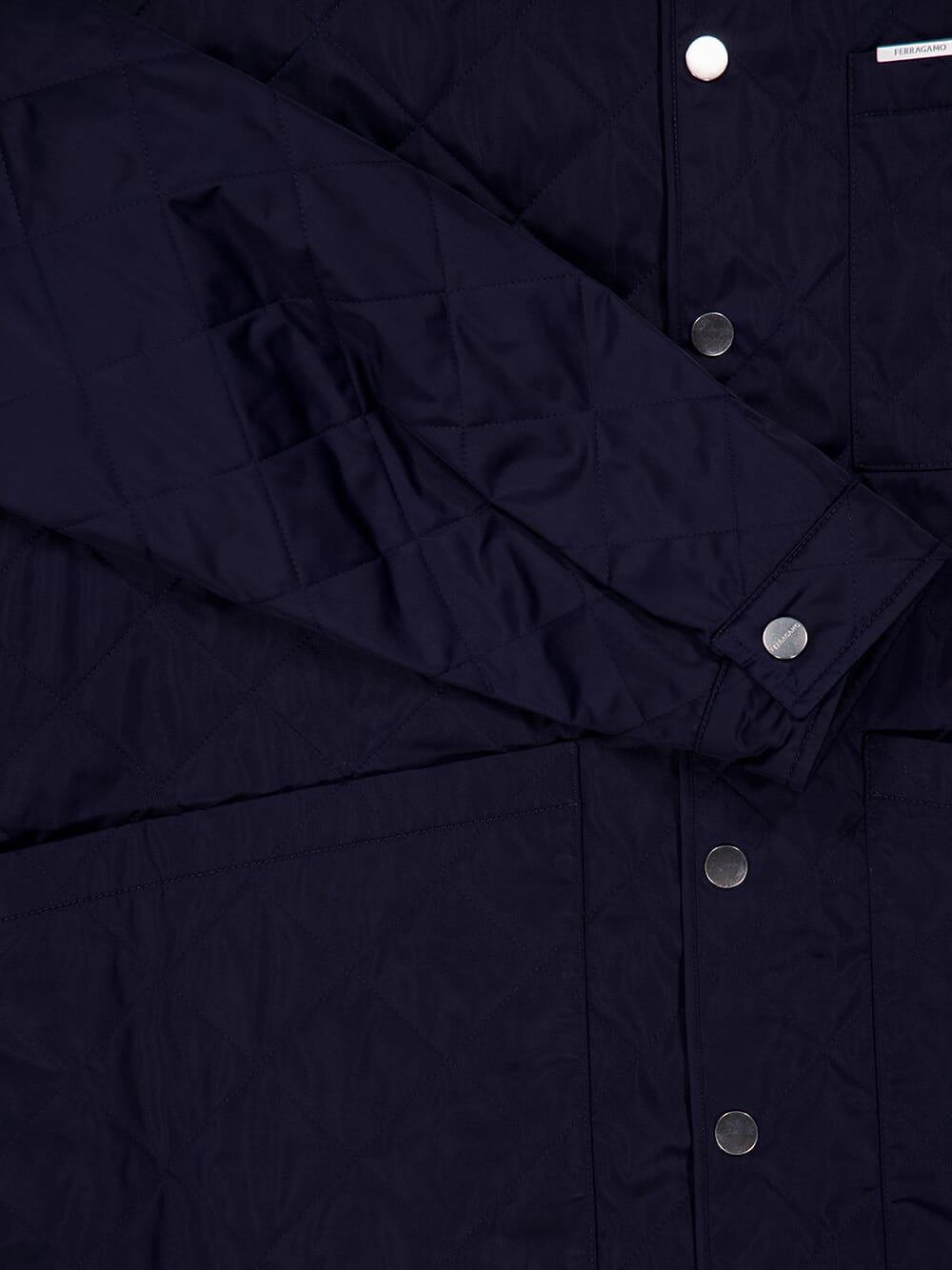 This navy quilted jacket by Ferragamo is crafted from water-repellent recycled nylon, blending functionality with sleek style. Featuring a classic collar, snap button closure, and front patch pockets, it offers warmth and elegance for cooler days. The quilted pattern adds texture and depth, while a subtle logo plaque at the chest highlights Ferragamo’s signature touch.