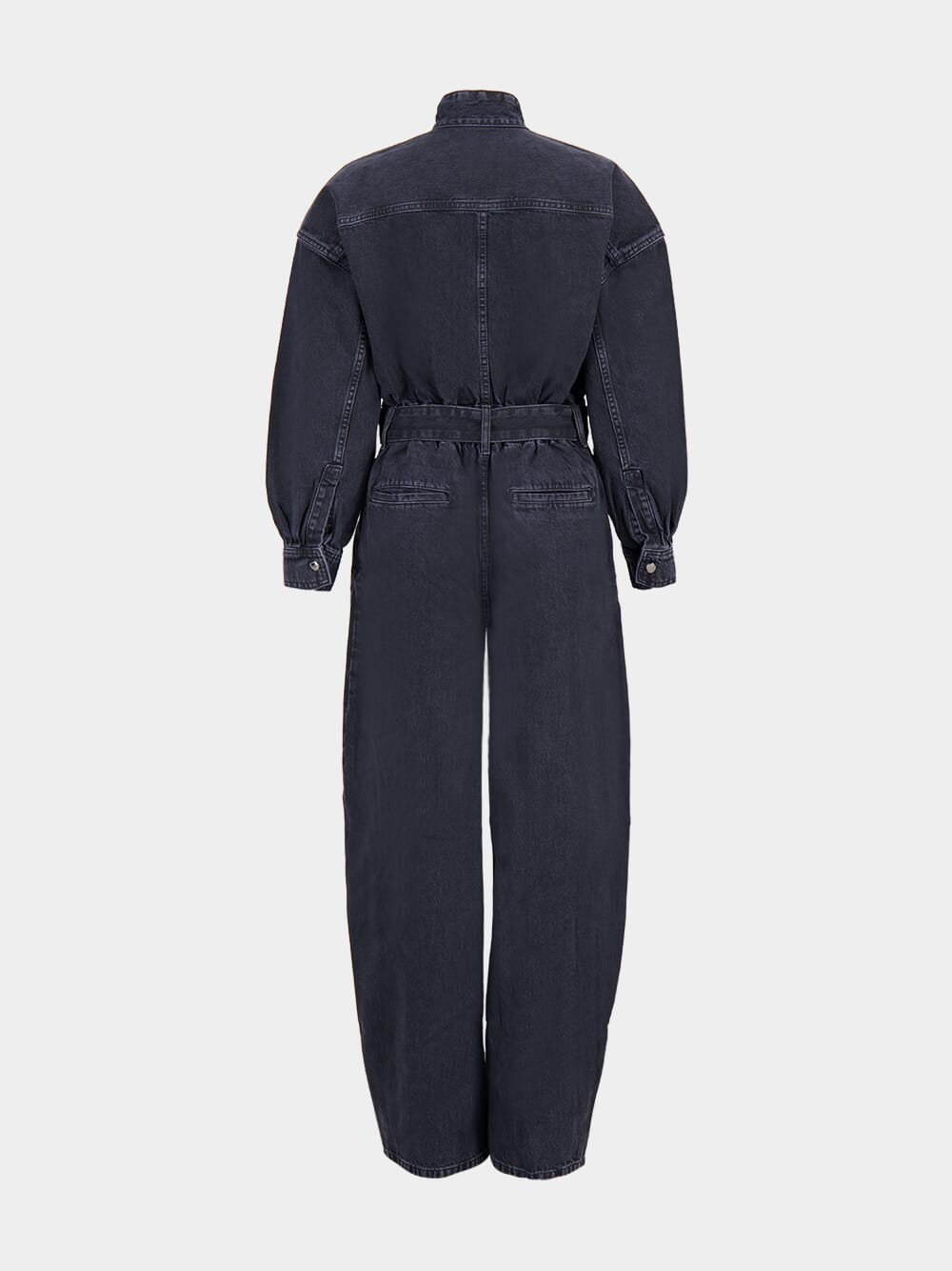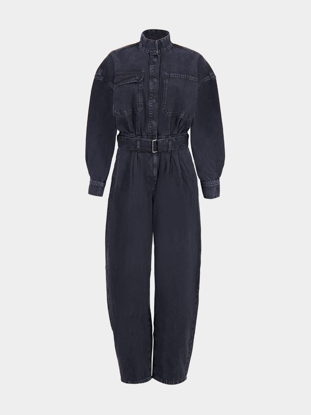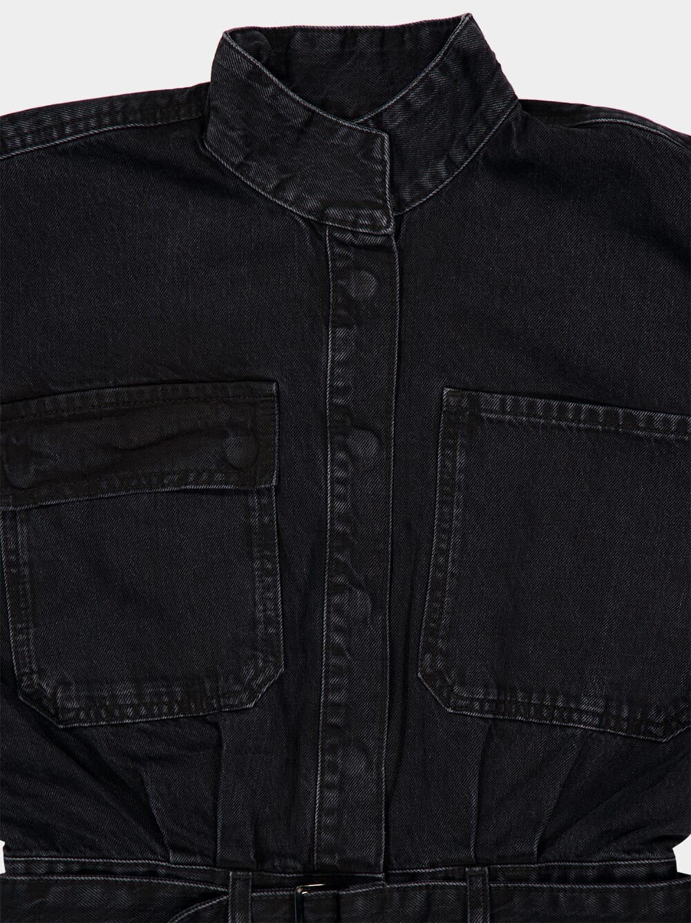 The Cocoon Jumpsuit in Portia redefines utilitarian elegance with a sophisticated all-black wash. Crafted with meticulous attention to detail, it features a full-length inseam, a structured stand collar, and asymmetric chest pockets that add a modern twist. The detachable belt accentuates the waist, creating a flattering, cinched silhouette. Perfect for versatile styling, this FRAME jumpsuit is your go-to piece for effortless yet polished ensembles.