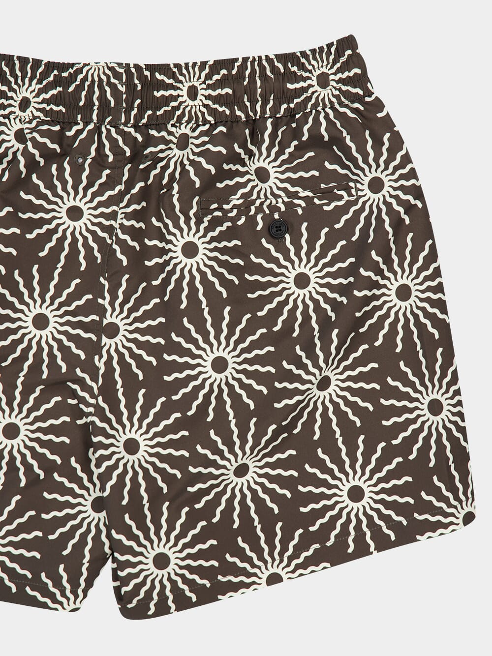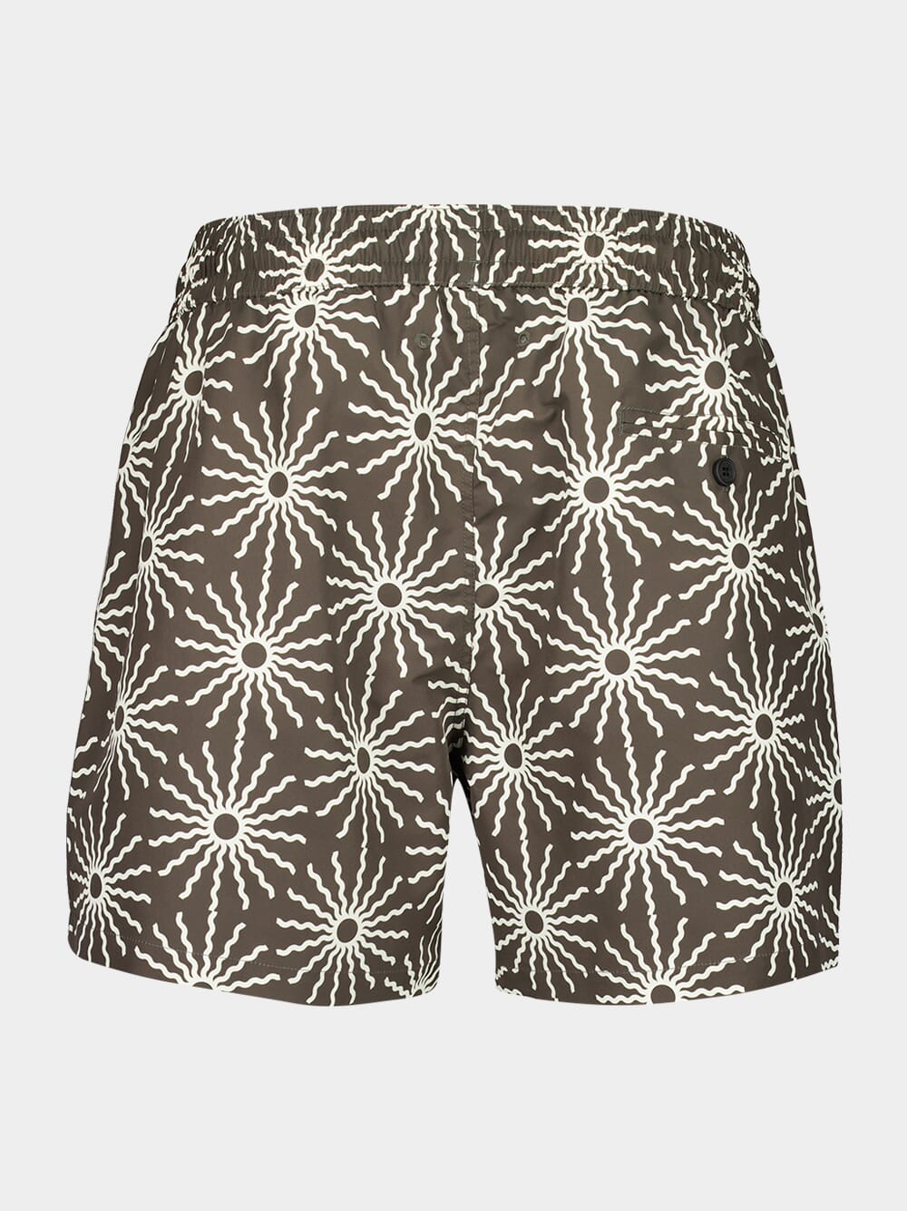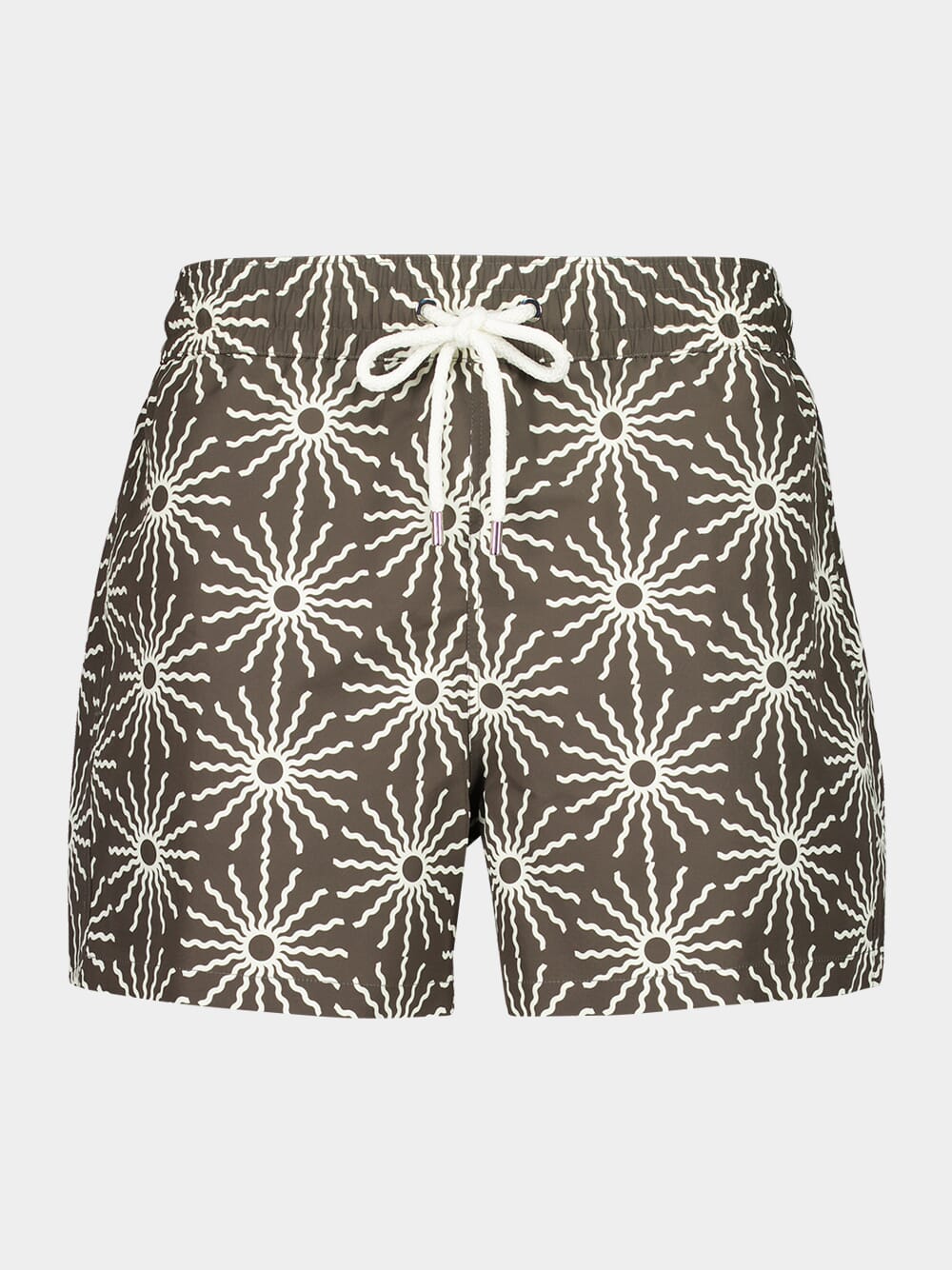 The Rio Swim Shorts in seawood green feature the vibrant "O Sol" print, inspired by the Brazilian lifestyle. Crafted from 100% recycled polyester, these lightweight, quick-drying swim shorts are designed for comfort and style. They feature an adjustable drawstring waistband for a perfect fit, making them ideal for beach days and poolside relaxation.
