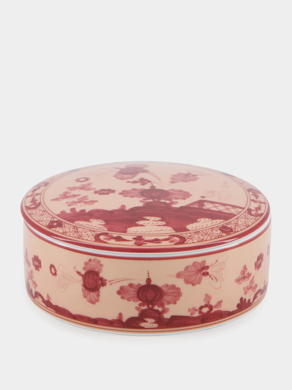 The Vermiglio Potiche vase from the Oriente Italiano collection stands out with its bold red carnation motif set against vermilion pink porcelain. Available in two sizes and a palette of colors, this piece, some adorned with gold threading, enriches the Ginori 1735 vase selection, creating vibrant and characterful spaces.