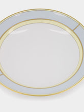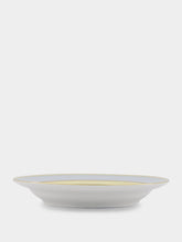 The New Diva collection's porcelain soup plates feature a delicate Celeste design, elegantly highlighted by luxurious gold threading. These plates are perfect for serving first courses, complementing the flat, bread, and dessert plates in the collection. Designed to be mixed and matched with the line's pastel shades, the plates reflect the versatility and elegance of mid-century Italian design.