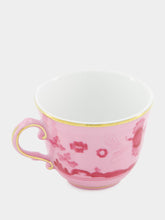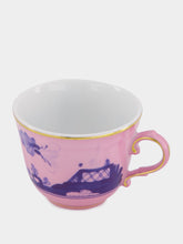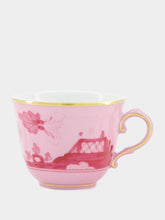 This exquisite porcelain coffee cup from the Oriente Italiano Gold Collection exudes sophistication, blending Italian craftsmanship with oriental allure. The vibrant red hue is gracefully adorned with delicate floral motifs in pure gold, creating a captivating contrast. The luxurious gold detailing enhances the classic Antico Doccia shape, making it an elegant addition to any refined table setting. Perfectly paired with matching saucers, this piece brings a touch of opulence to your coffee moments, reflecting both tradition and modern elegance.