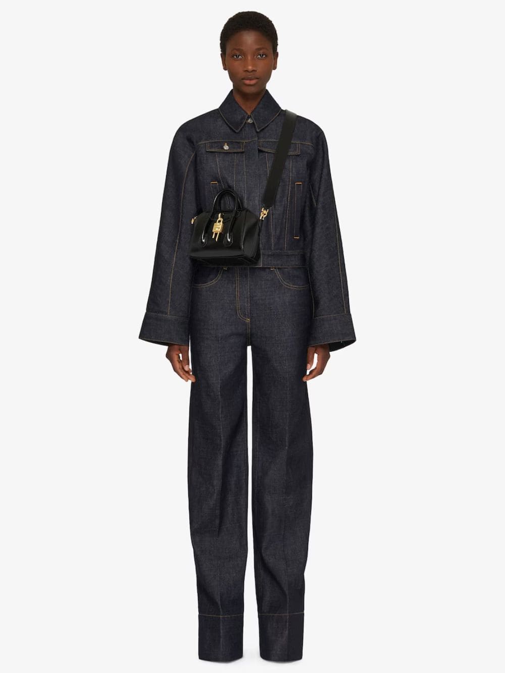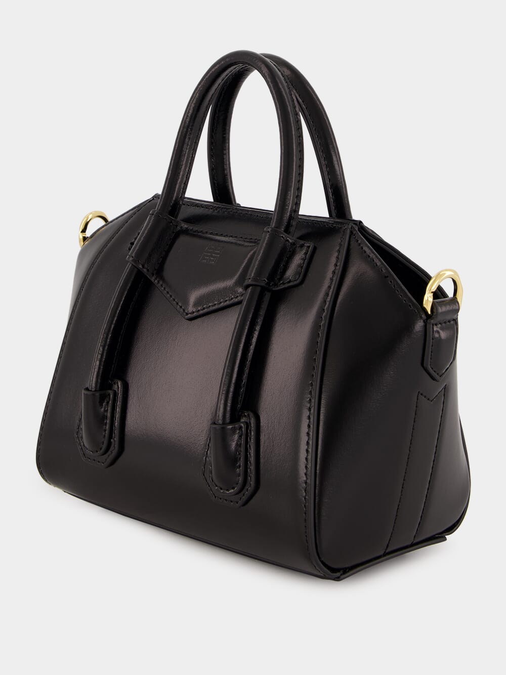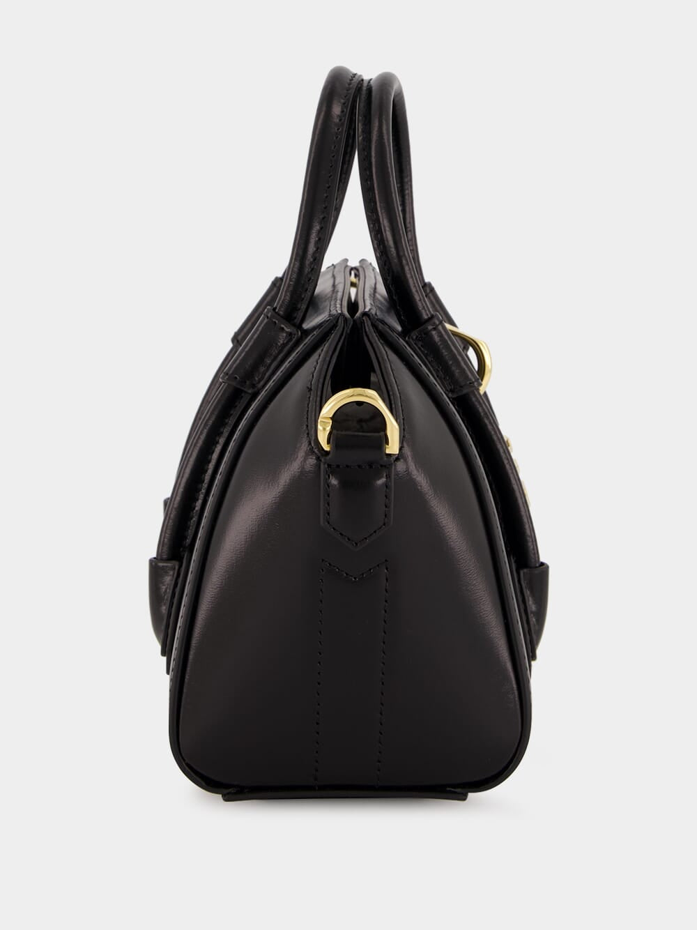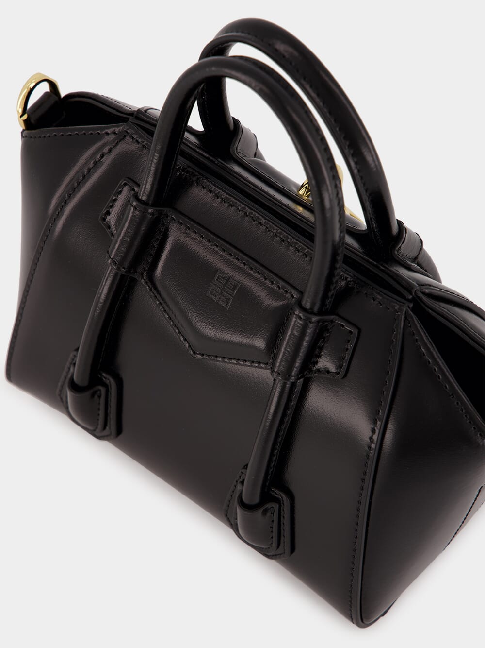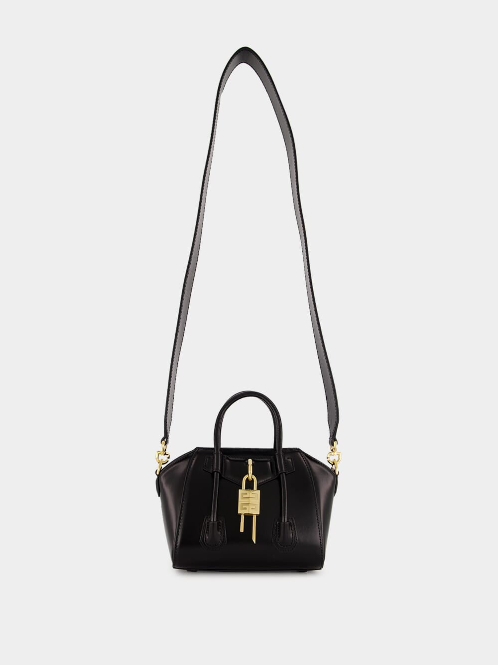 The Black Antigona Toy Lock Bag by Givenchy is a sleek mini handbag or crossbody crafted from luxurious Box calfskin leather. Part of the Antigona Toy line, it features a magnetic closure, leather top handles, and a large removable leather shoulder strap with the GIVENCHY signature. The front showcases a pentagonal patch with a removable gold 4G padlock, while the back is adorned with a debossed 4G emblem. Inside, a spacious main compartment and a flat pocket provide functionality. Finished with golden metal details, this Italian-made bag exudes modern elegance.