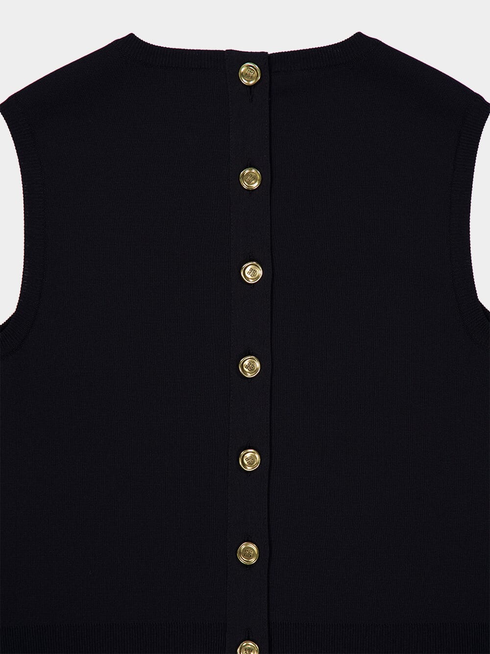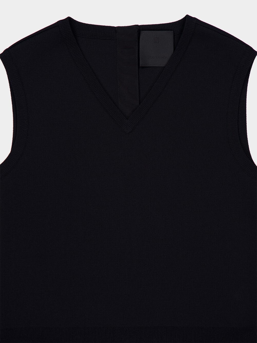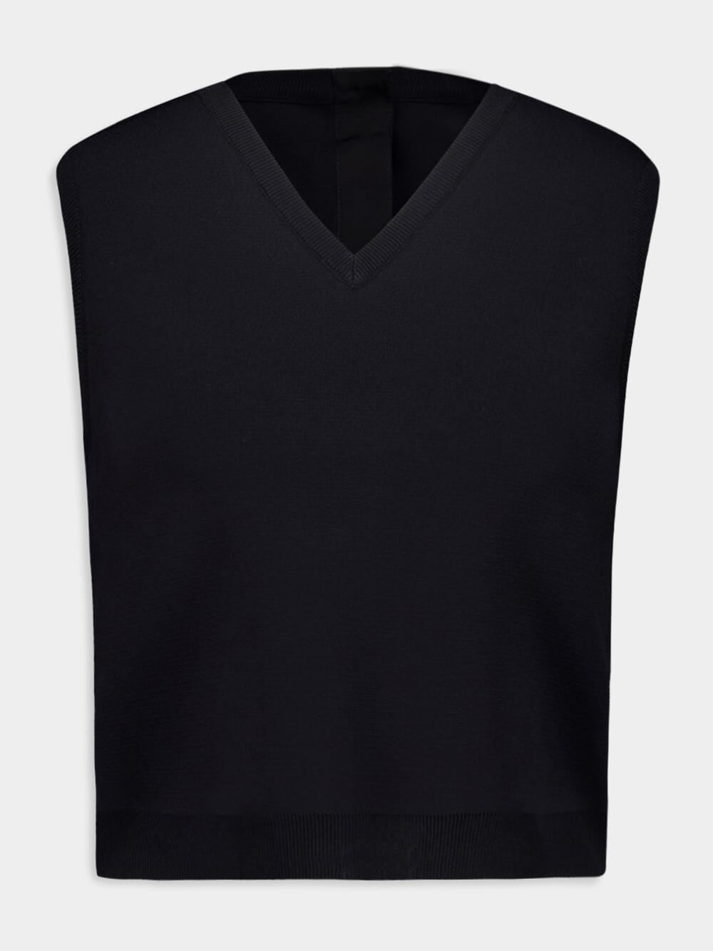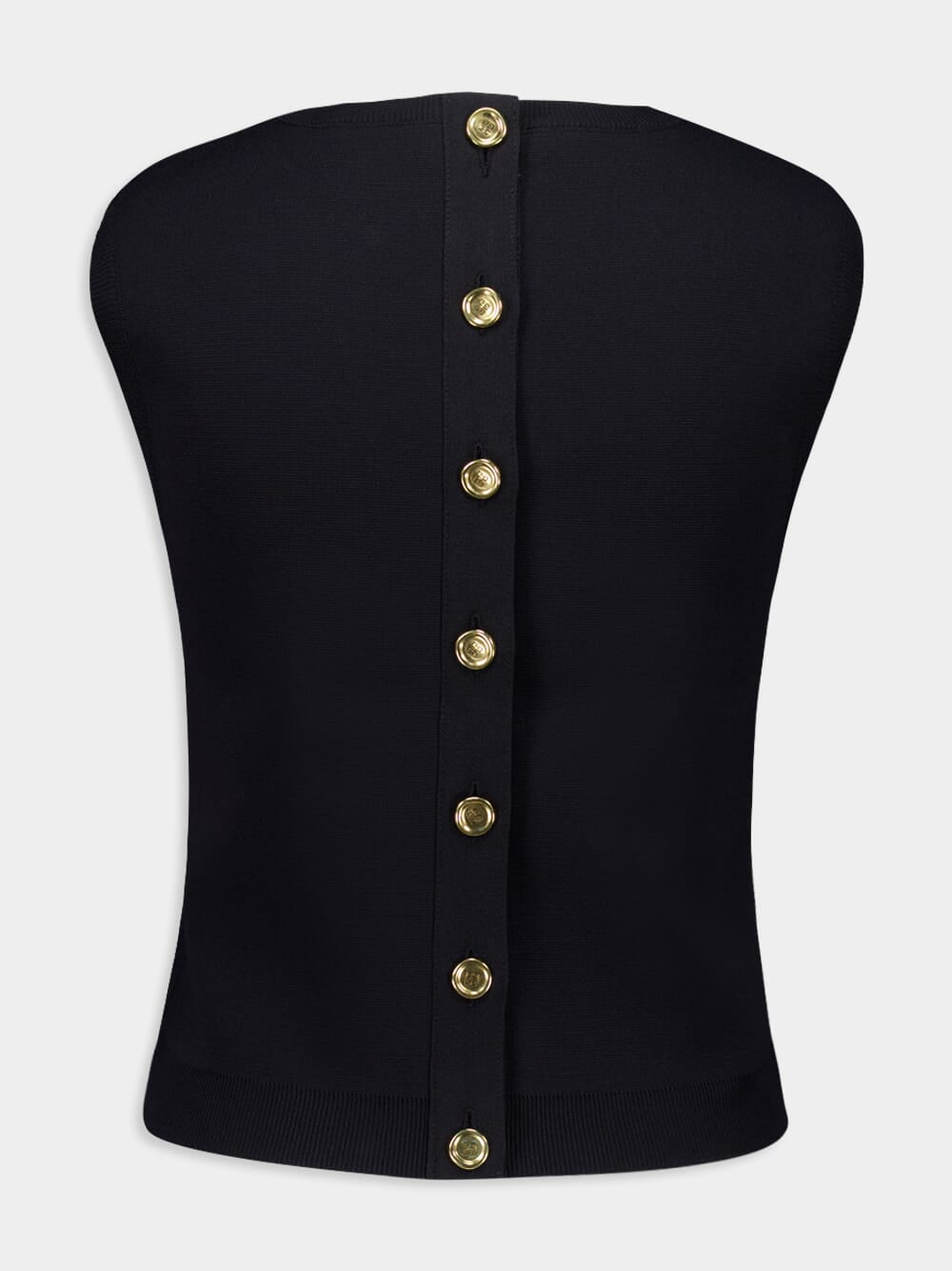 Elegant and minimal, this black sleeveless gilet by Givenchy is crafted from a soft viscose blend. The cropped silhouette features a refined V-neckline and ribbed hem, adding structure and versatility to your wardrobe. Gold-tone buttons at the back elevate the design, ensuring it transitions seamlessly from day to evening looks. Perfect for layering or as a stand-alone statement piece.