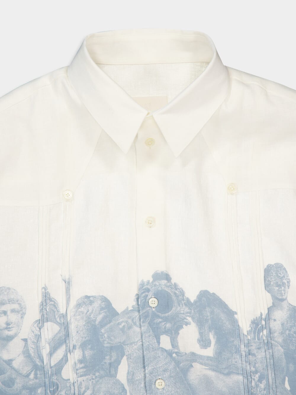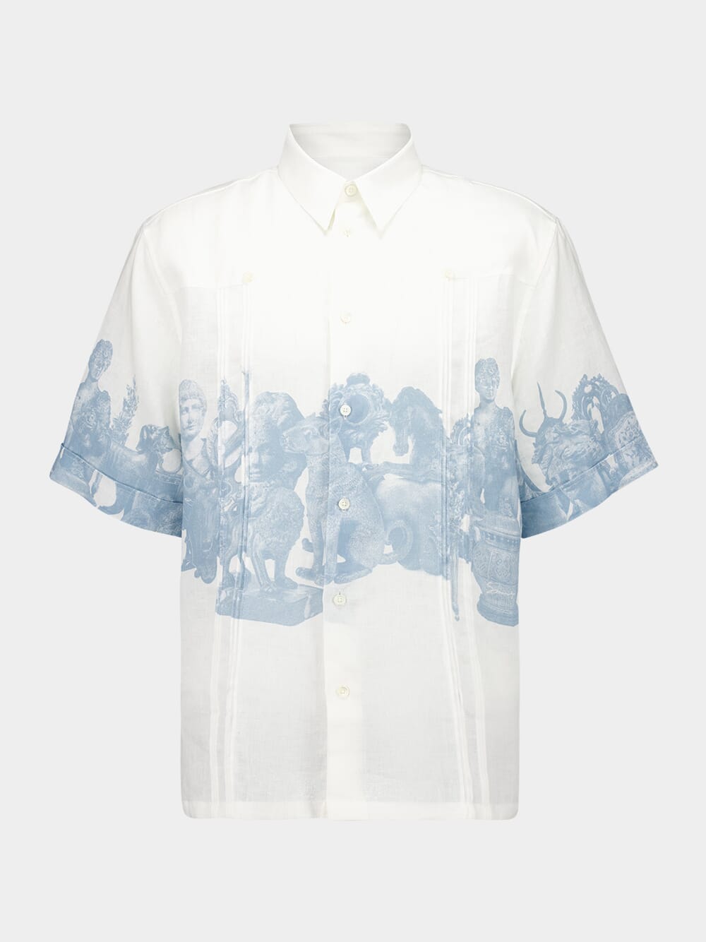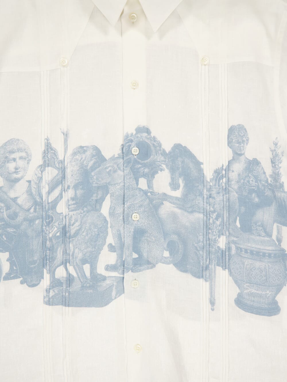 This elegant Givenchy shirt in 100% linen showcases a distinctive Hubert objects print in soft blue, bringing an artistic edge to the classic short-sleeved design. Featuring a classic collar, button closure, subtle side slits, and a small GIVENCHY signature woven into the pattern.