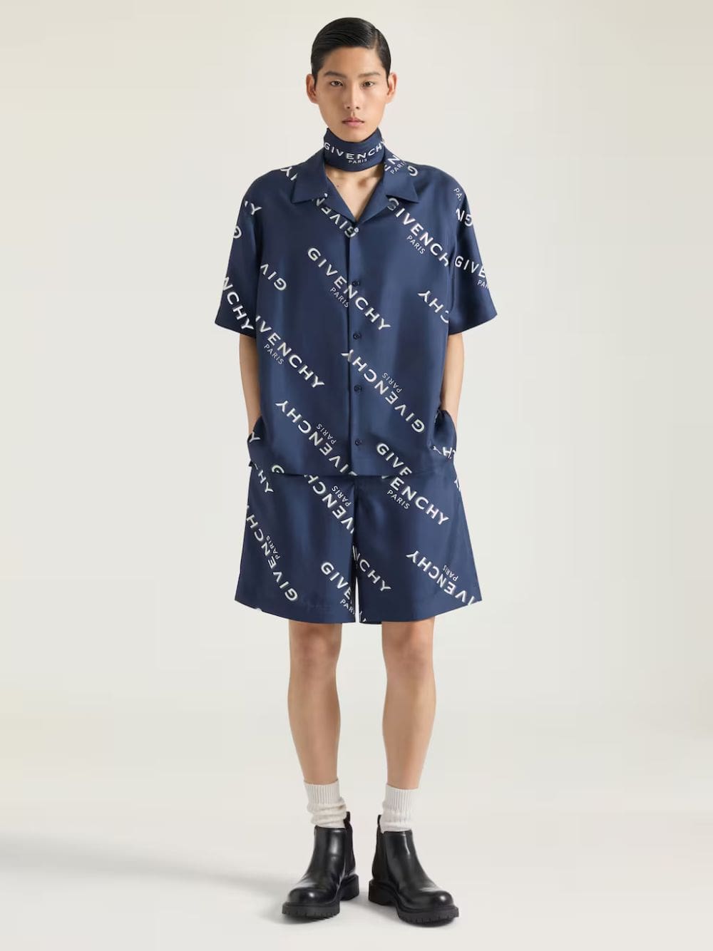 These Navy Silk Bermuda Shorts by Givenchy are crafted in luxurious silk twill, offering a refined yet relaxed silhouette. Designed with an elastic waistband and drawstring for comfort, they feature the iconic GIVENCHY Shadow print all over. Practical details include two side pockets and one back pocket, blending ease with sophistication. A statement piece that elevates resort and casual looks with timeless elegance, made in Italy.
