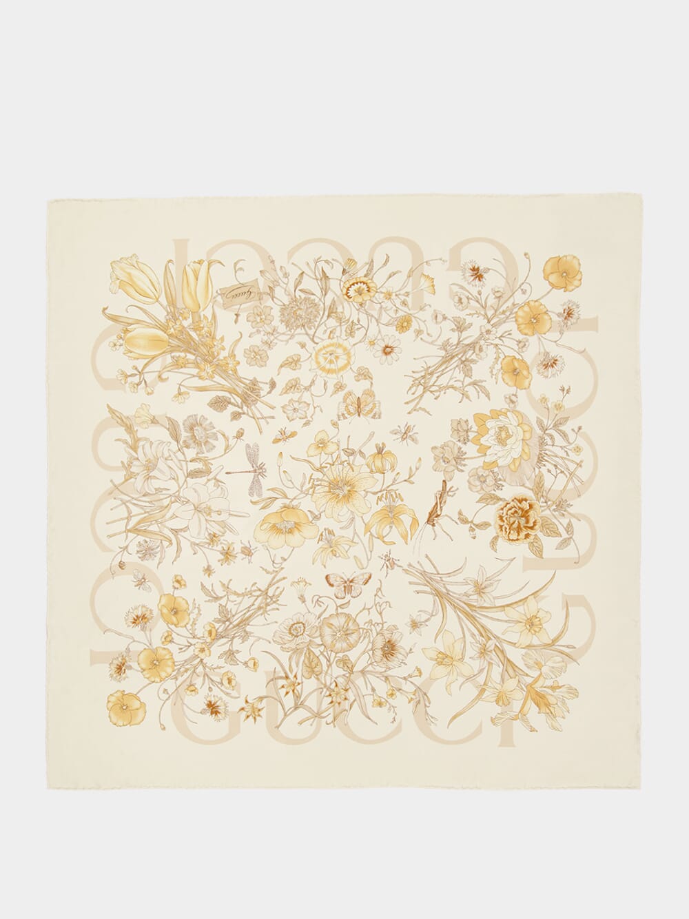 The historical Flora print is reimagined for the Cruise 2025 collection. This carré in ivory silk features the Gucci Flora print, adding a romantic touch to any look. Crafted with precision, the accessory reflects the House's commitment to timeless elegance.