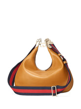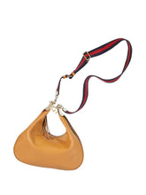 Gucci Attache camel leather shoulder bag with green and red Web trim, golden hardware and G hook closure with zip.