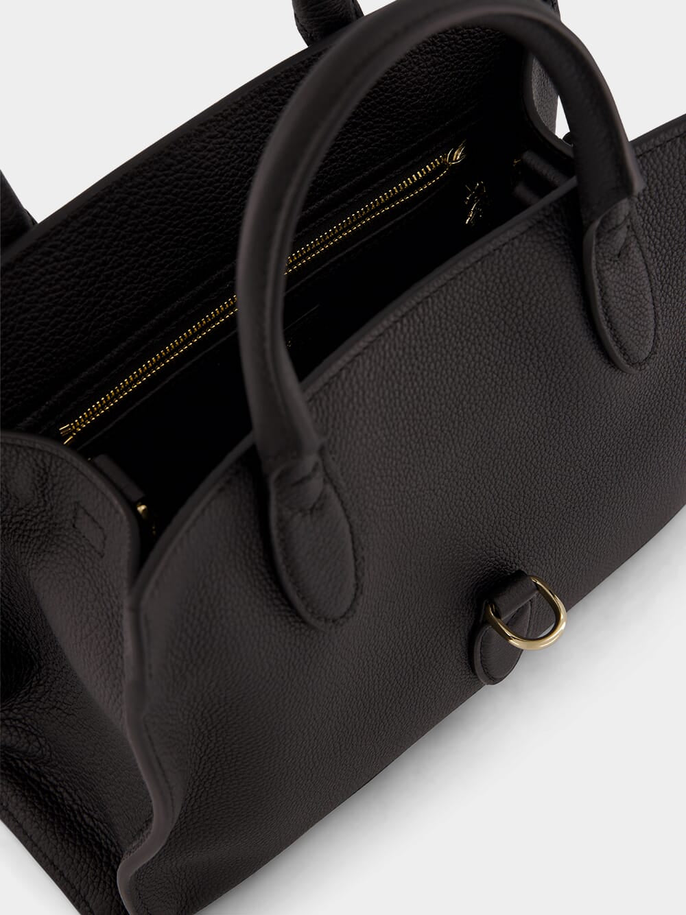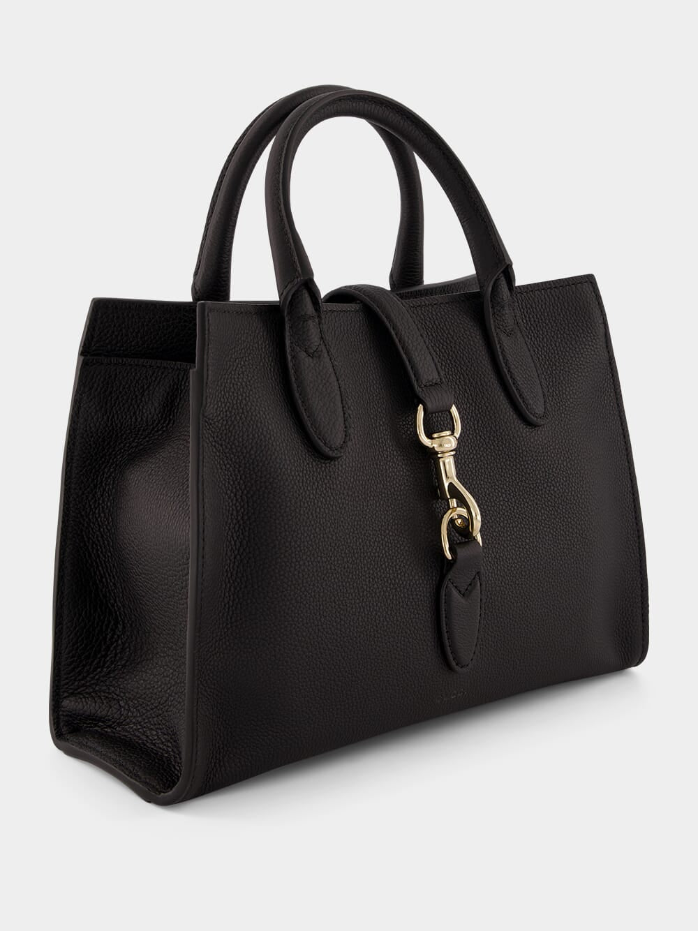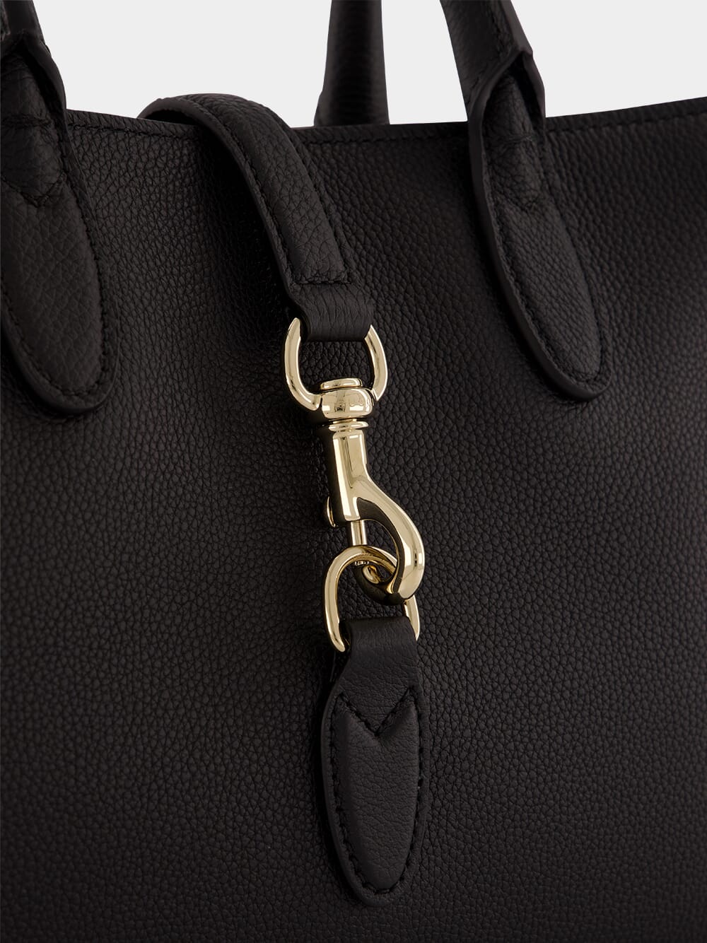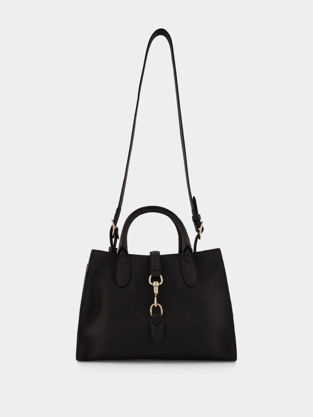 This medium tote by Gucci is crafted in soft grainy black leather with light gold-toned hardware. Featuring a signature hook closure, two interior zip pockets, and a detachable adjustable shoulder strap, it is both functional and sophisticated. Perfectly sized to fit an iPhone Pro Max, long wallet, lipstick, and more.