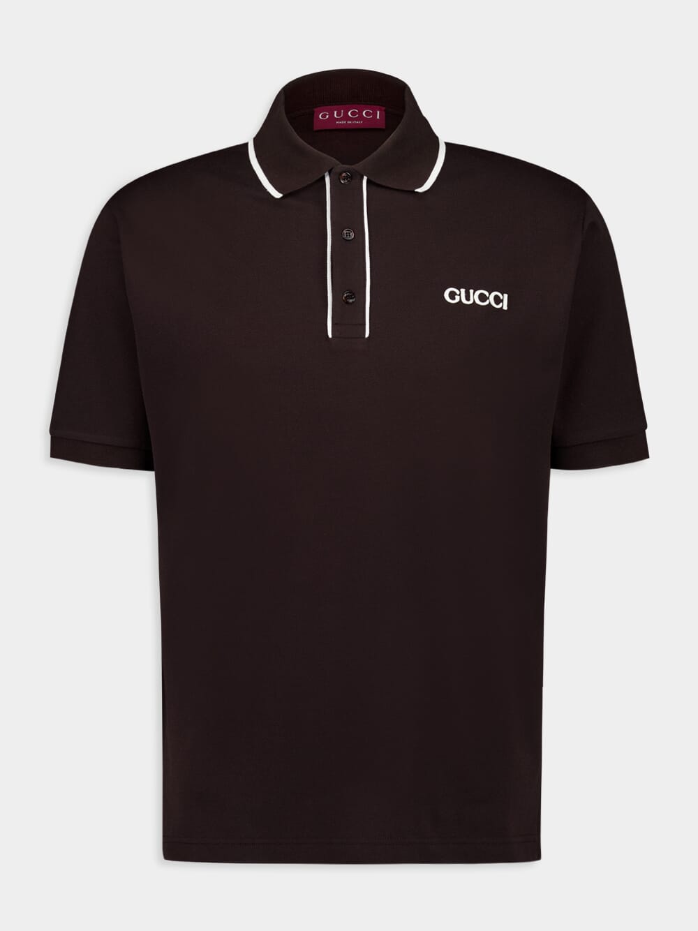 This classic brown cotton piqué polo shirt combines timeless design with refined details, perfect for elevating everyday looks. Crafted from stretch cotton piqué, it features contrasting white piping trim and the iconic Gucci embroidery on the chest. The design includes a polo collar, dropped shoulders, short sleeves, and rib trim for a comfortable regular fit. Made in Italy, this piece showcases luxury craftsmanship and understated elegance.