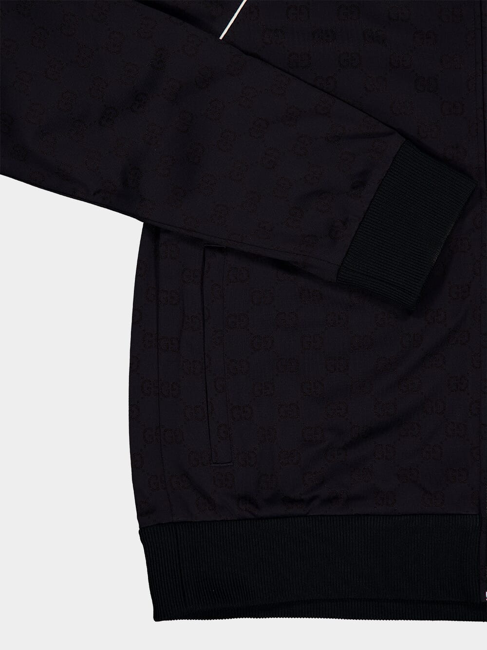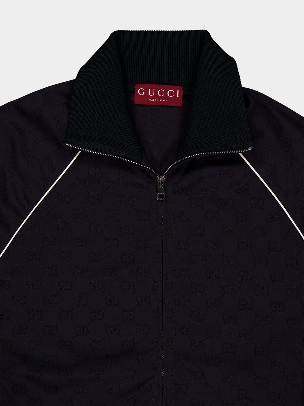 Gucci's House codes are reimagined for the new season in jersey pieces. This slim-fit zip jacket features a GG nylon and cotton technical jersey jacquard with a nod to the iconic monogram motif. Accentuated with white piping trim, a funnel neck, and long raglan sleeves, it includes two front pockets and rib trims for a polished look.