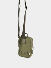 This forest green mini sling bag in GG canvas by Gucci offers a fresh take on a classic icon. Highlighting the house's signature monogram, it’s trimmed in tonal leather and detailed with the iconic green and red Web stripe. Compact yet functional, it fits essentials like an iPhone Pro Max, card case, and AirPods. Featuring a nylon lining, internal and external pockets, and an adjustable strap, it's the ideal everyday crossbody.