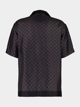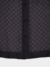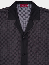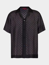 From the Pre-Fall 2025 collection, this Gucci bowling shirt in grey and black silk twill features the iconic allover GG print. Cut in a relaxed, regular fit, it is detailed with a notch collar, dropped shoulders, and short sleeves. A chest pocket, side slits, and button closure complete the design, merging luxury with laid-back elegance. A refined yet casual staple for the contemporary man’s wardrobe.