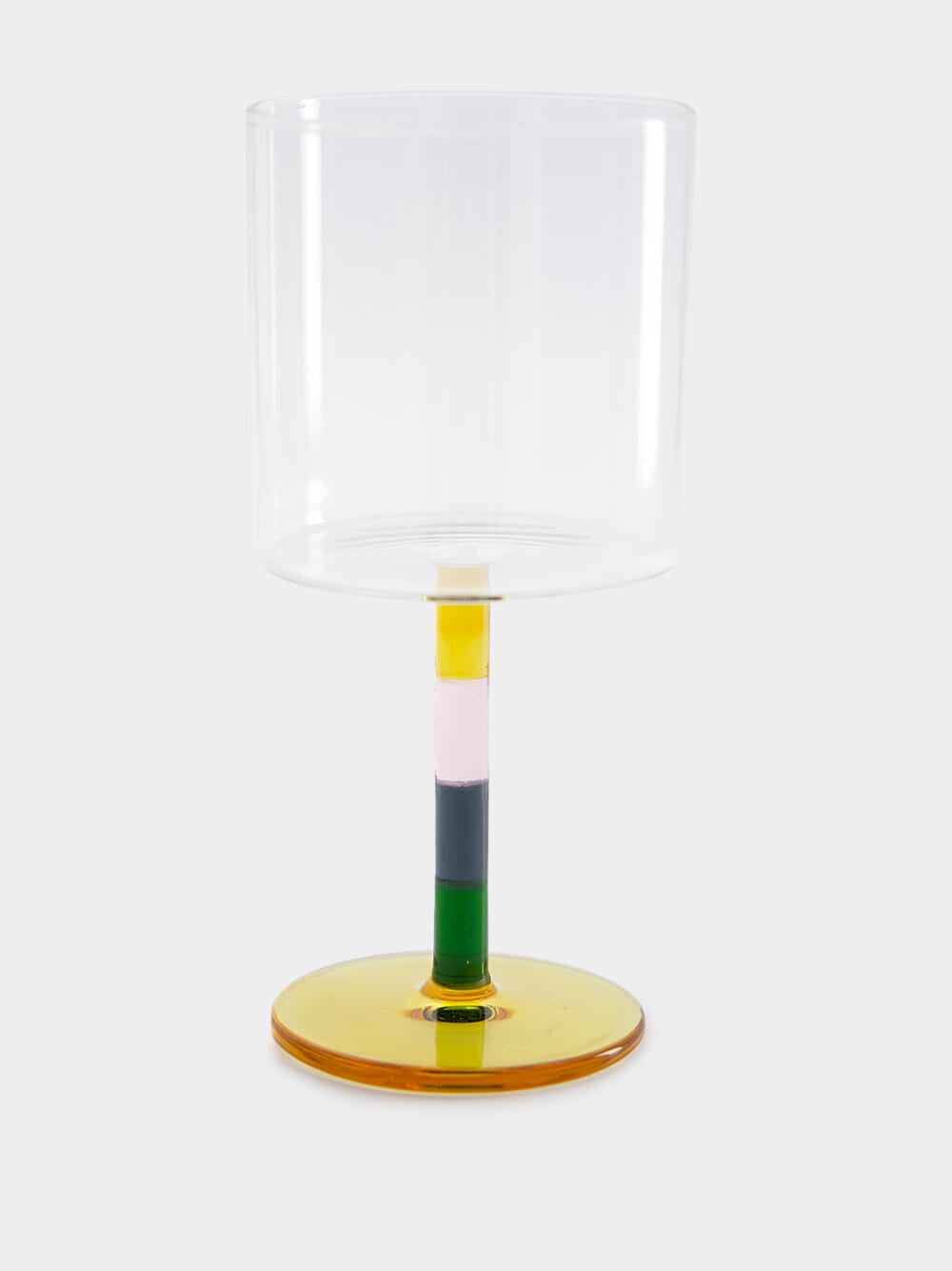 A fusion of contemporary art and viniculture, this stemmed wine glass features a clear bowl atop a vibrant, multicolored stem, resting on a sleek, dark base. Perfect for the modern entertainer, it's a statement piece for any sophisticated social gathering.