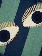The Visage Vintage NN Cushion by JP Demeyer & Co is a captivating piece that merges surreal design with luxurious detail. Featuring two expressive eyes woven across alternating green and navy stripes, it brings an artistic and whimsical energy to any room. Framed with deep blue artisan-made fringe and filled with premium goose down, it offers both visual impact and exceptional comfort. A statement cushion for bold, creative interiors.