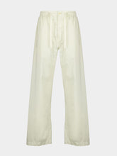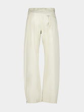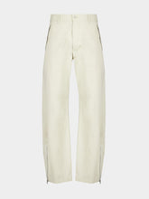 These cream multi-topstitch Taekwondo pants from Lemaire are crafted in a garment-dyed blend of light cotton and satin, giving them a soft touch. Inspired by martial arts, they feature an oversized fit with an extended pivot crotch for added mobility. The pants are detailed with multiple topstitching for a lighter feel and have two side welt pockets and a single back pocket with a button fly. Ideal for casual wear, they combine comfort with a refined aesthetic.